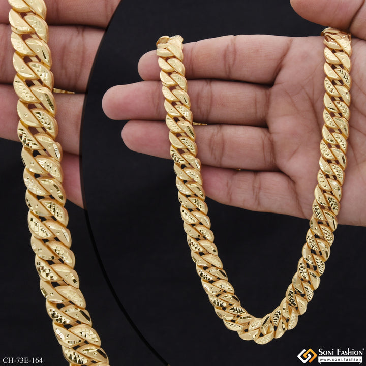 Elevate your style with this 1 gram gold-plated Pokal chain designed for men. Crafted from brass with a beautiful filigree hollow design, this 22-inch chain offers a shining, trendy look that complements any outfit. Its miligram gold plating ensures a rich golden finish while keeping it lightweight and comfortable for daily wear. Perfect for those who appreciate detailed craftsmanship and lasting elegance.
