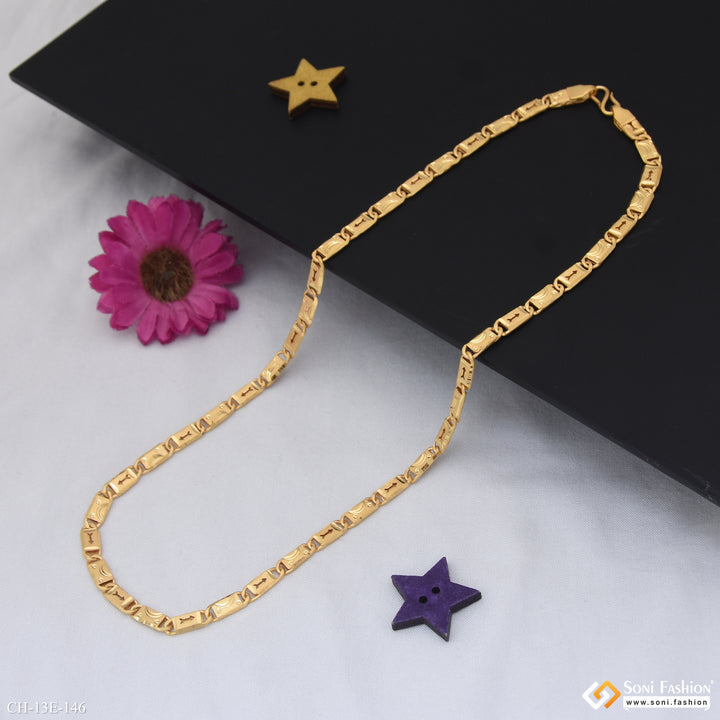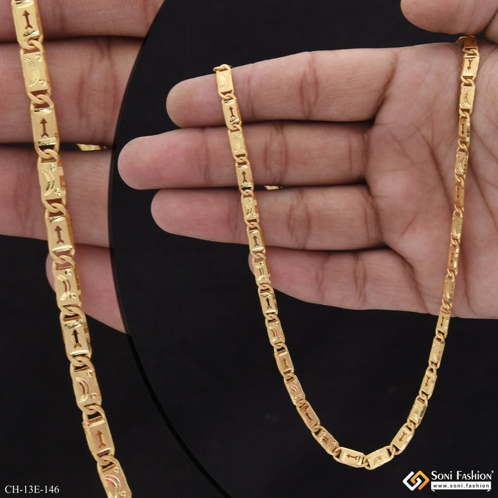 This 20-inch artisanal Nawabi chain for men features a golden brass build with intricate filigree design and arrow motifs. Its high-quality golden plating delivers a shining finish that enhances style and durability. Ideal for those seeking a regal yet modern accessory.