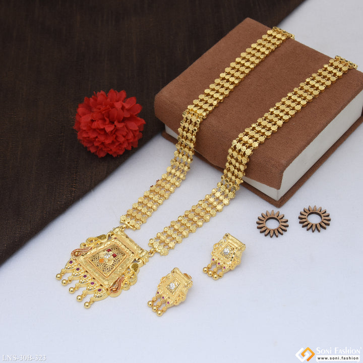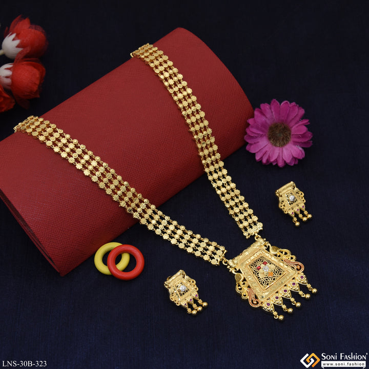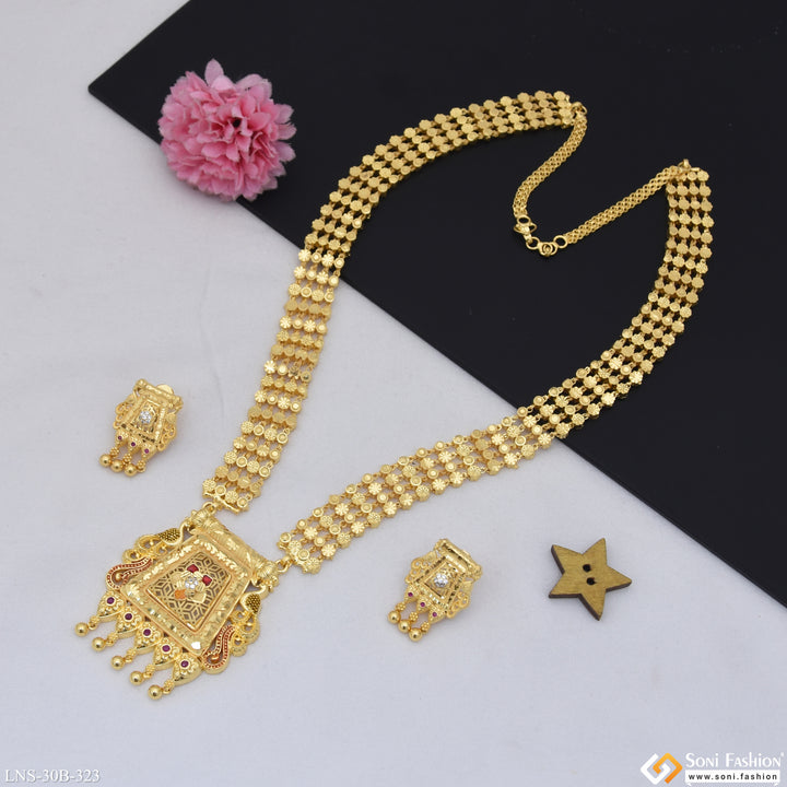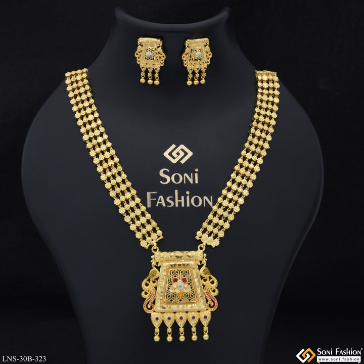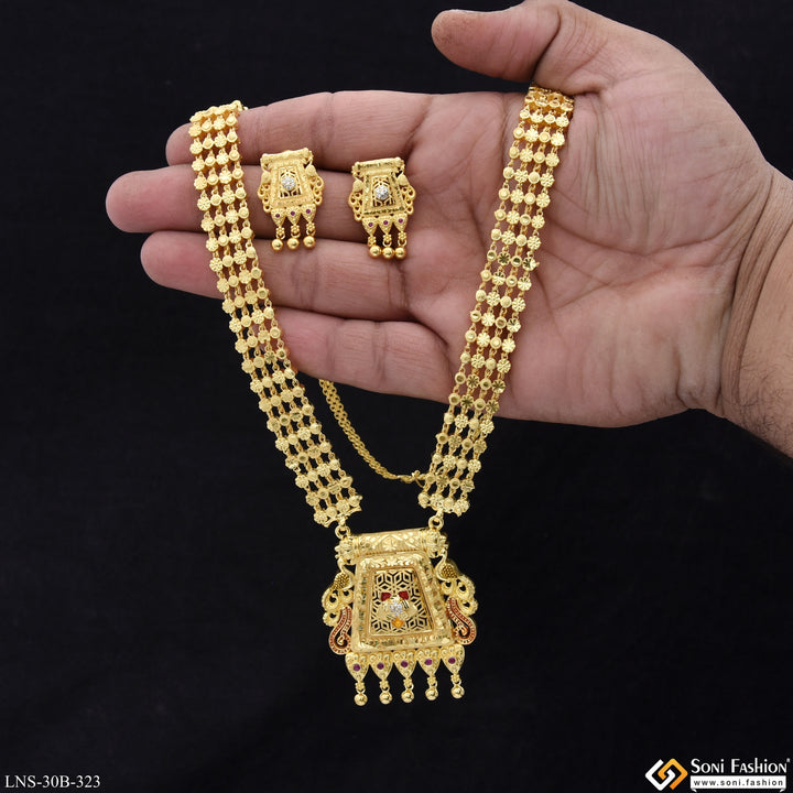 Elevate your jewelry collection with this exquisite gold-plated necklace set, meticulously crafted with traditional filigree design work. The intricate detailing showcases skilled artisanal craftsmanship, while the long-length design offers flattering versatility for various occasions. An investment piece that transitions seamlessly from everyday wear to special celebrations.