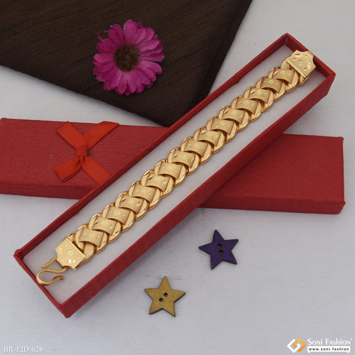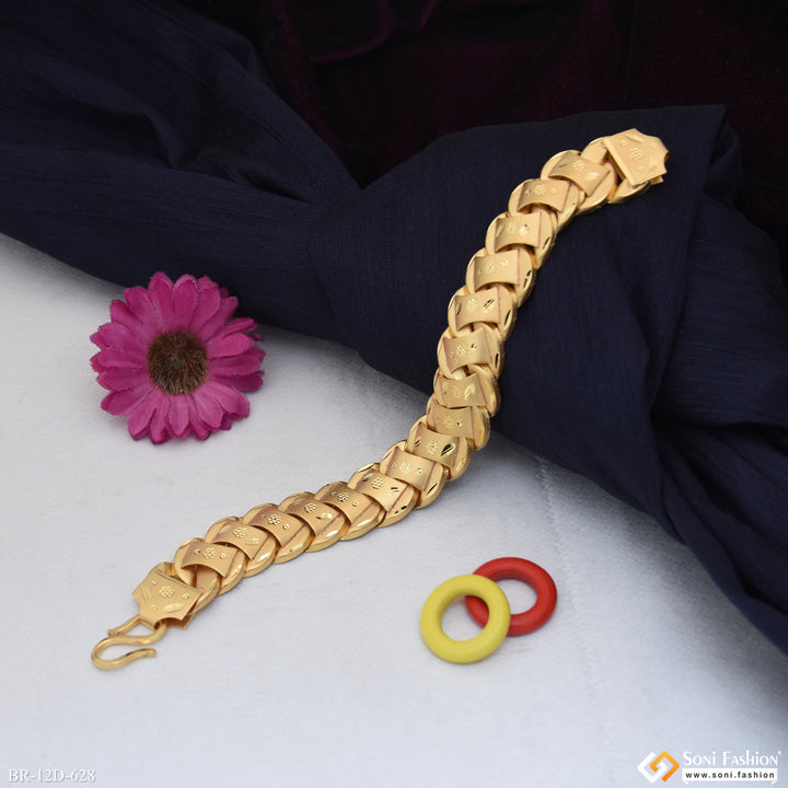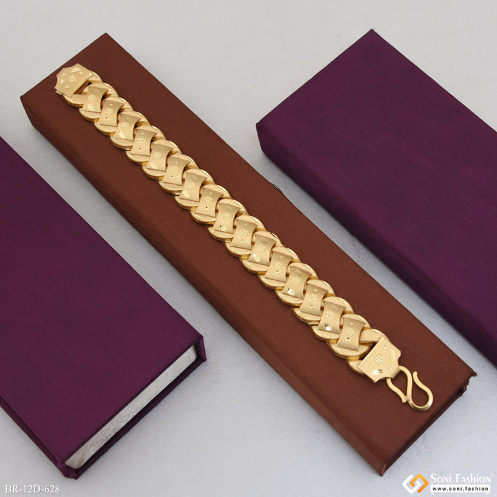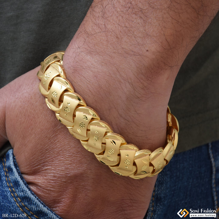 Elevate your style with our Artisanal Design Gold Plated Pokal Bracelet for Men. This shining, royal bracelet features a matt finish and a unique hollow design for a luxurious and lightweight...