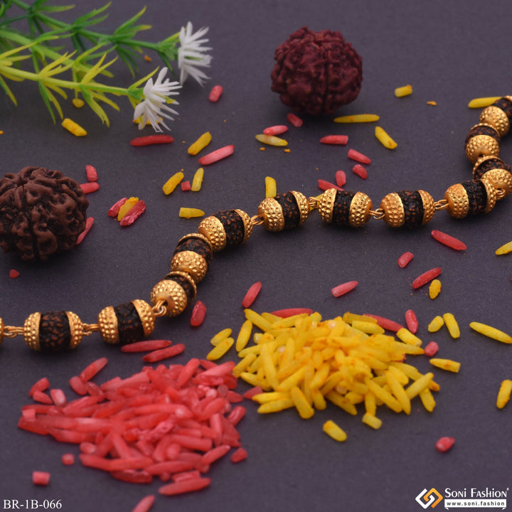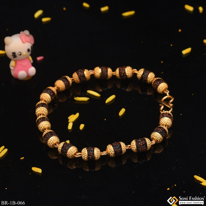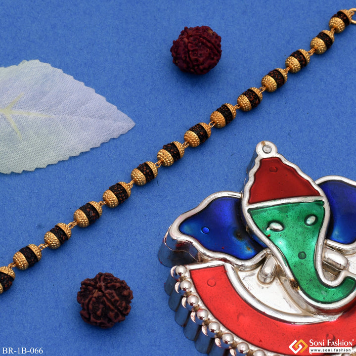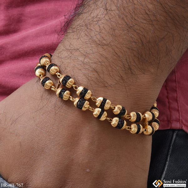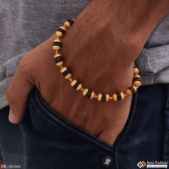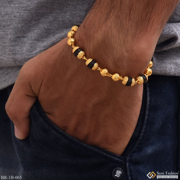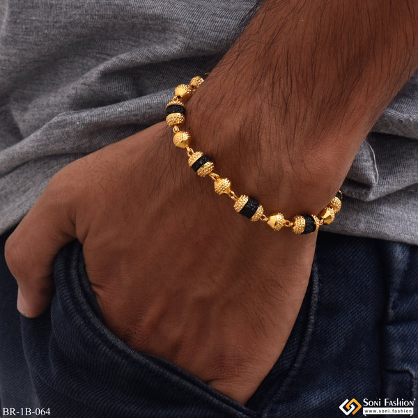 Experience the perfect blend of style and tradition with our Bead Exciting Design High-Quality Gold Plated Bracelet. This textured bracelet, featuring Rudraksha beads and Hid_Reg_Plating, brings a touch of elegance to any outfit. Crafted from brass, our Bracelet-Regular is a golden and black bracelet that is both timeless and unique.