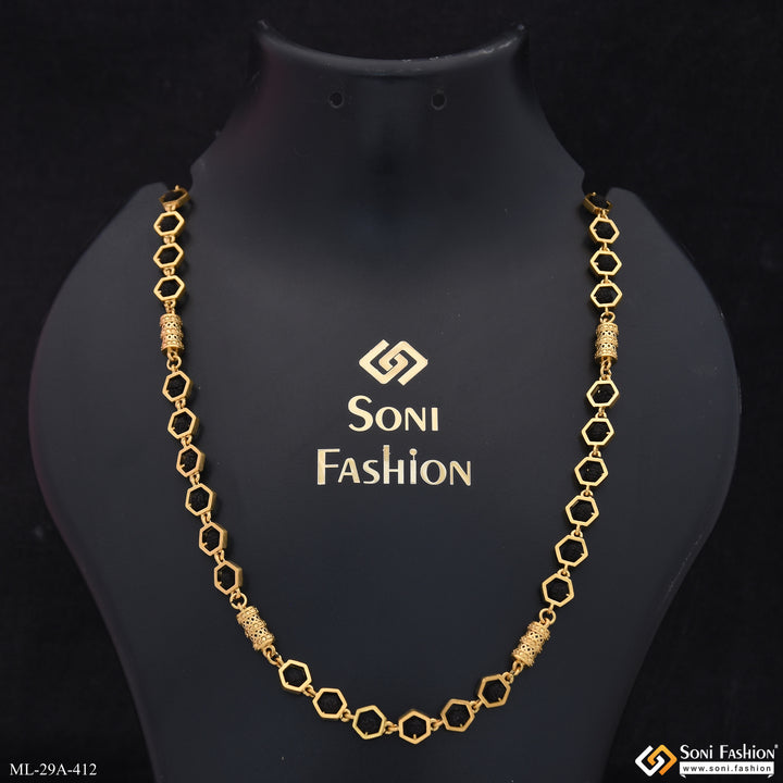 This Rudraksha Mala for Men is made with the utmost quality, featuring shining 18k gold plating and a royal brass diamond design. The traditional hexagon shape of the mala is highlighted by the contrast between the black beads and the golden accents, creating a striking and religious accessory.