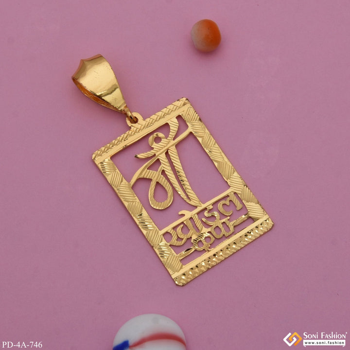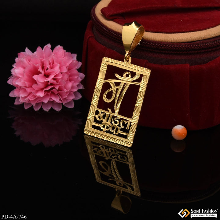 Expertly crafted with brass and coated in high-quality Hid_Reg_Plating, this golden pendant features a textured, matt finish and a rectangular shape. Showcasing religious significance, it is designed with the iconic Maa...