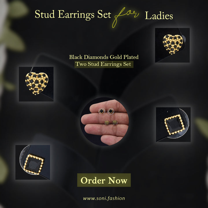Black Diamonds Gold Plated Two Stud Earrings Set for Ladies - Style A200
