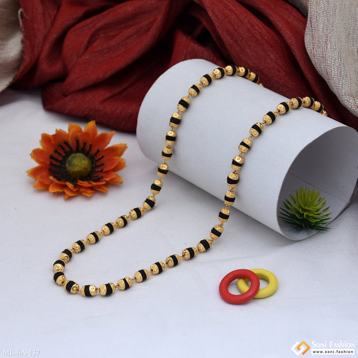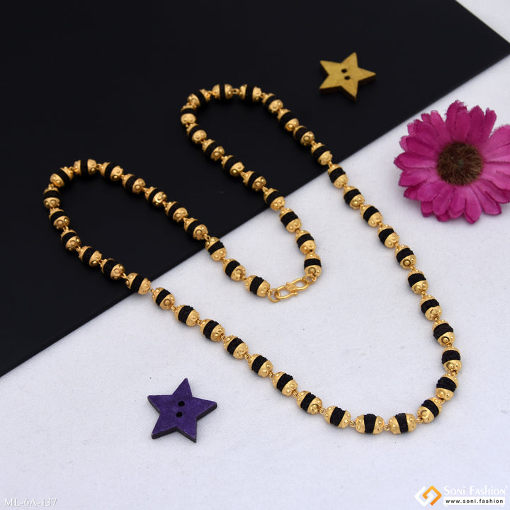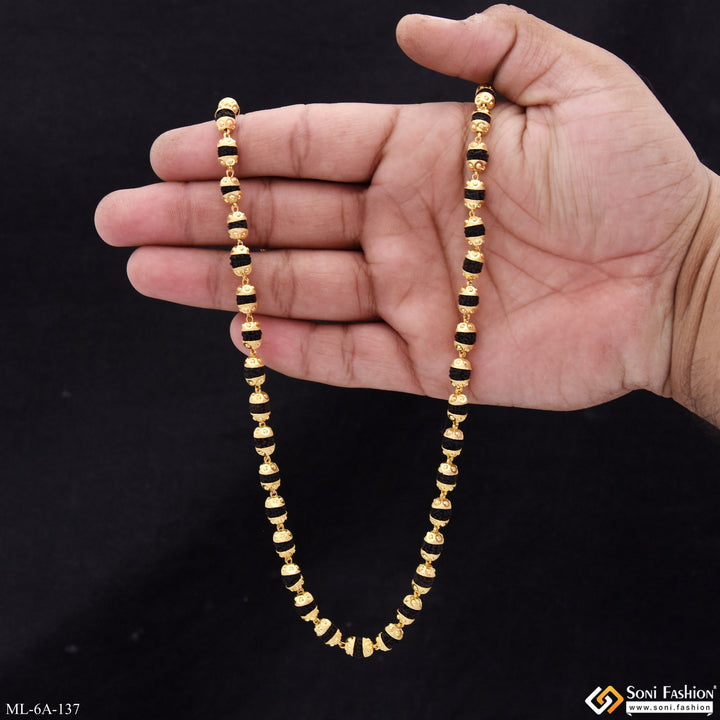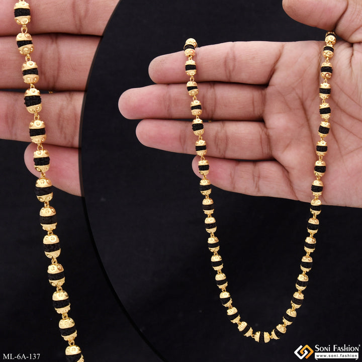 This Black Small Unique Design Gold Plated Rudraksha Mala combines traditional spirituality with elegant craftsmanship. Handmade with textured brass beads and a matt finish, this religious mala features black rudraksha beads plated in gold for a striking contrast. Perfect for daily wear or special occasions, it offers both a meaningful accessory and a stylish statement.