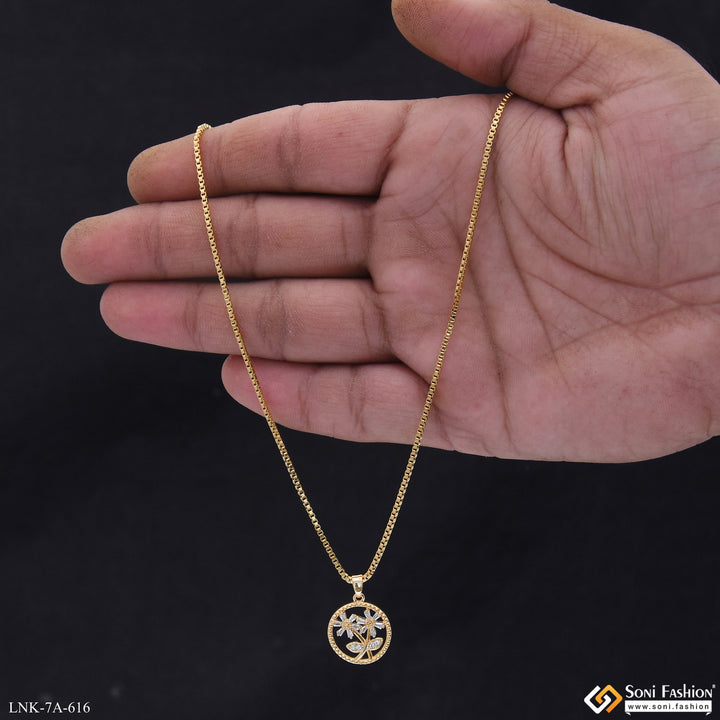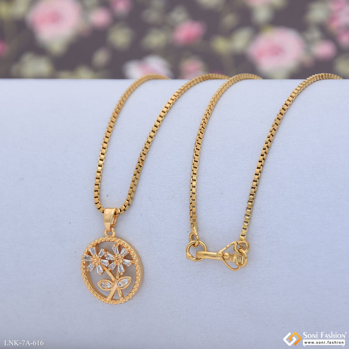 This gold-plated pendant features a shining round design, perfect for adding a touch of elegance to any outfit. Its latest trend flower and diamond details make it a must-have accessory for ladies. The brass material and hid_reg_plating ensure long-lasting quality. Elevate your style with this royal necklace.