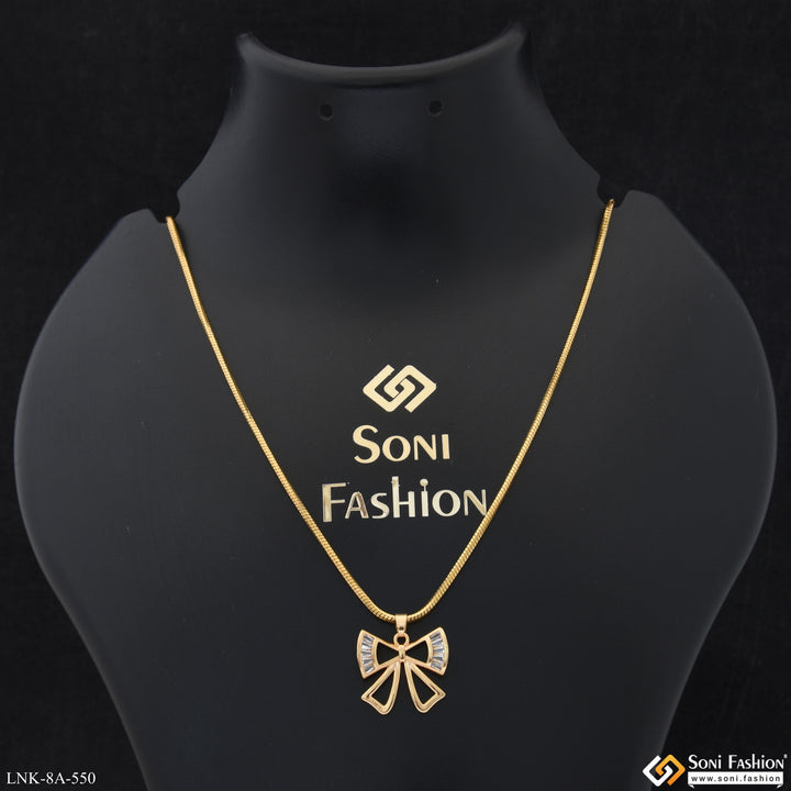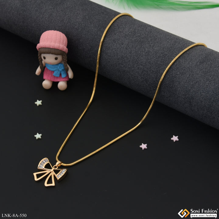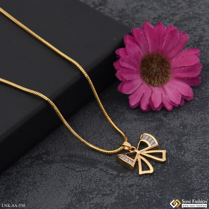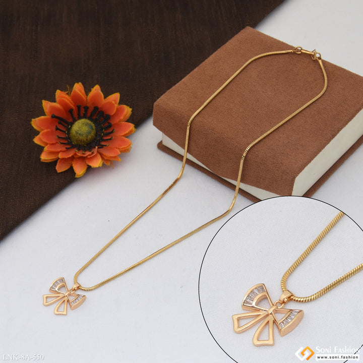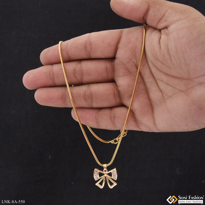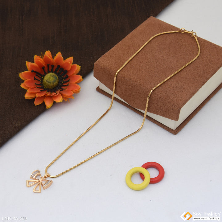 Introducing the Chic Design Gold Plated Chain Pendant for Ladies. This elegant pendant is crafted with a unique hidden rhodium plating that adds shine to the plain brass chain. Featuring a delicate diamond-studded bow knot, this necklace is the latest trend in fashion.