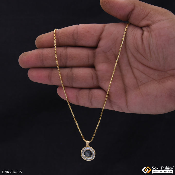 This shining and royal gold plated chain pendant is the perfect accessory for any fashion-forward lady. Its classic yet trendy design features a round blue diamond on a brass necklace, with the latest hide_reg_plating for a luxurious touch. Step up your style game with this elegant piece.