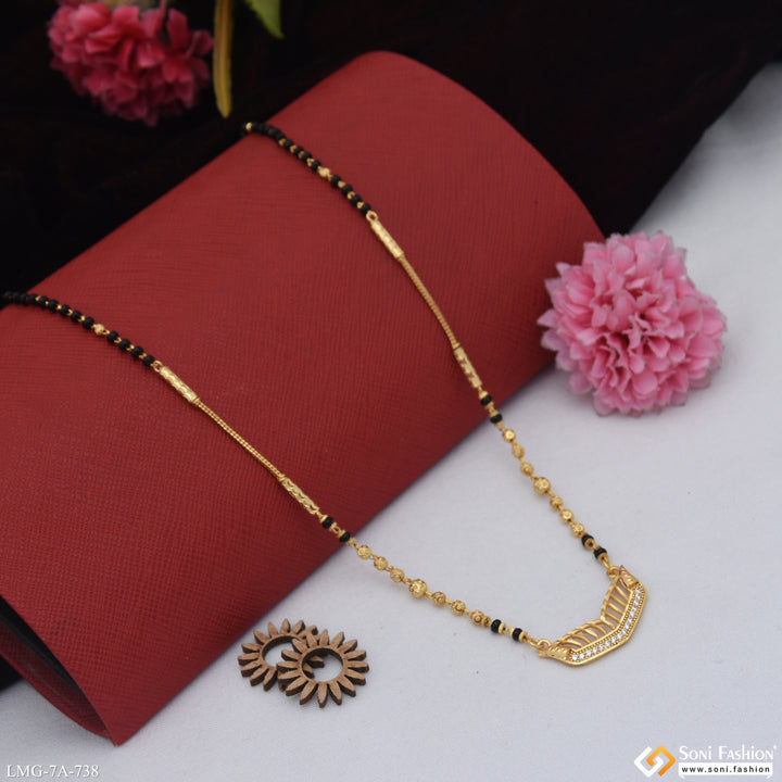 This classic gold-plated mangalsutra features a shining design with a single line of black beads and a touch of diamond-like sparkle. Crafted from brass with high-quality plating, it combines traditional elegance with modern style, making it a perfect accessory for everyday wear or special occasions.