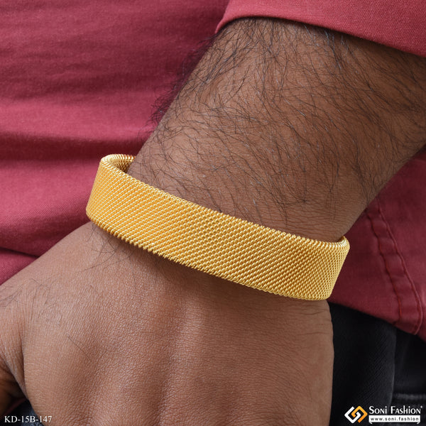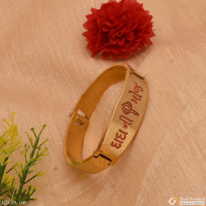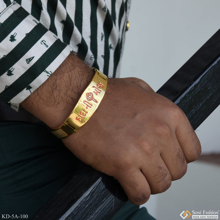 As a product of expert craftsmanship, the Dada Ni Moj Bracelet Kada combines style, spirituality, and durability. This religious oval kada features a lustrous golden design with a brass base, making it a timeless piece for men. Its high-quality hid_reg_plating ensures long-lasting wear.