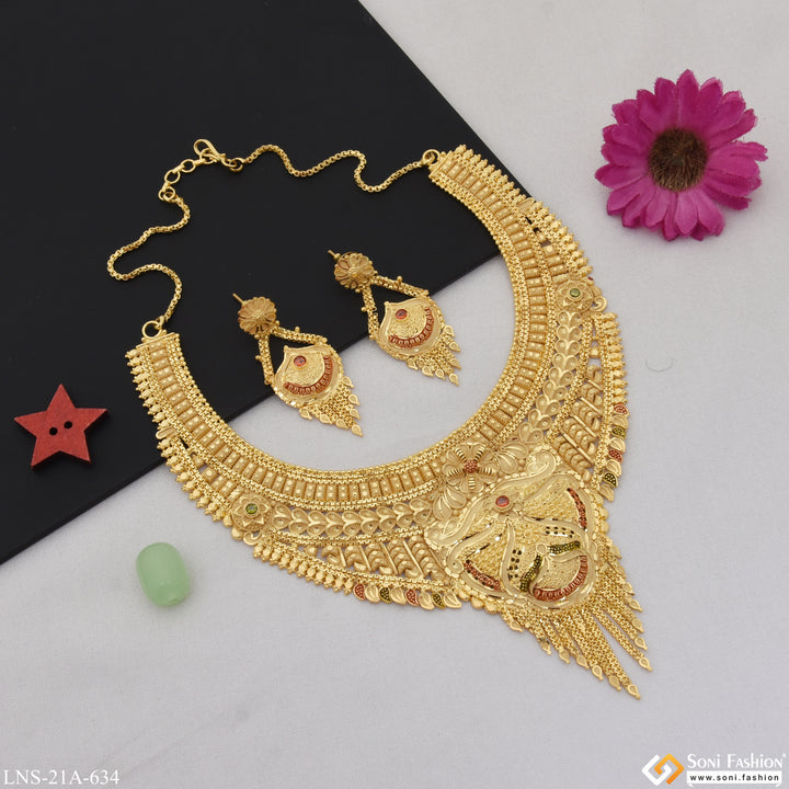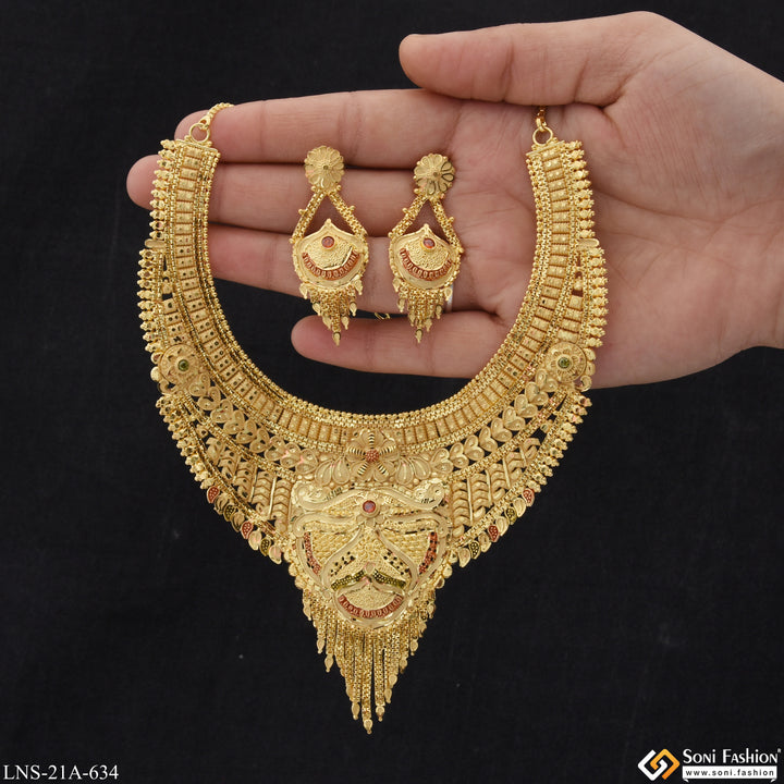 Discover the elegance and beauty of this Dazzling Design Fancy Design Gold Plated Necklace Set for Women. Embrace the traditional, royal style with its textured, shining, and multicolor design. Stay on top of the latest trend with its hid_reg_plating and filigree design, accented with diamonds and crafted with brass. Perfect for bridal occasions or any special event.