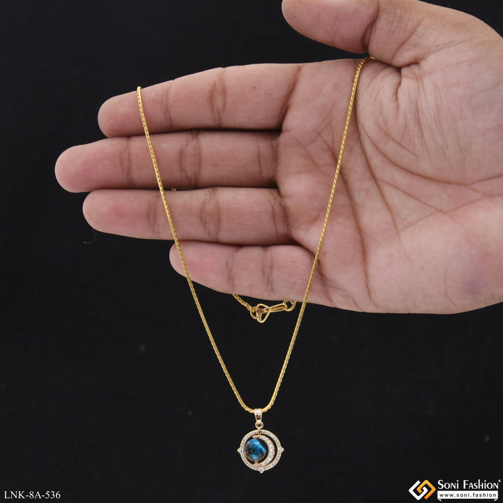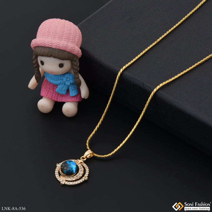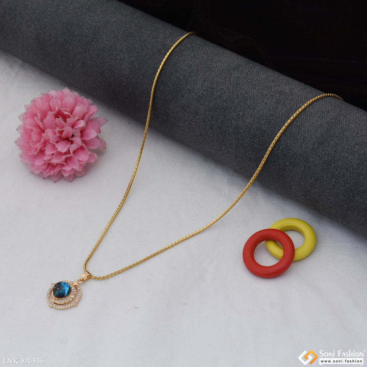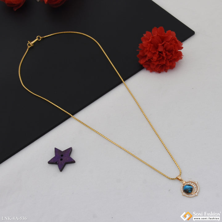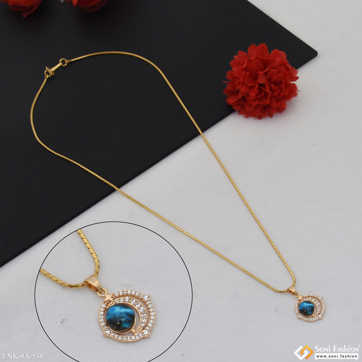 As a product expert, I recommend the Dazzling Design Gold Plated Chain Pendant for Ladies. This golden necklace features a royal and shiny design, perfect for the latest trend. With hid_reg_plating and brass material, the round blue necklace is also adorned with a sparkling diamond, making it a stunning addition to any outfit.