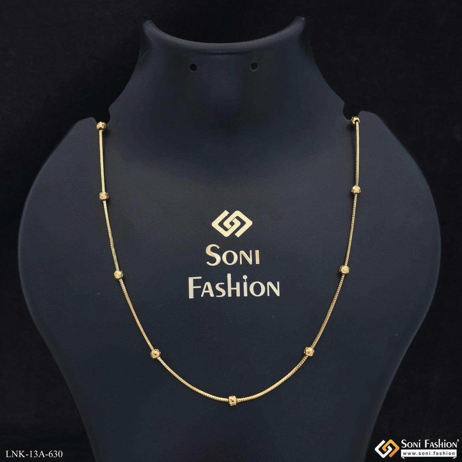 This golden ball chain is the perfect accessory for any lady. Its shining and royal appearance, coupled with the intricate filigree design and high-quality brass material make it a must-have for any stylish outfit. The chain is plated with a special Hid_Reg_Plating to ensure long-lasting beauty.