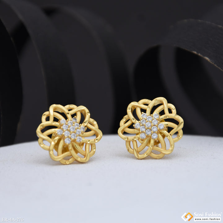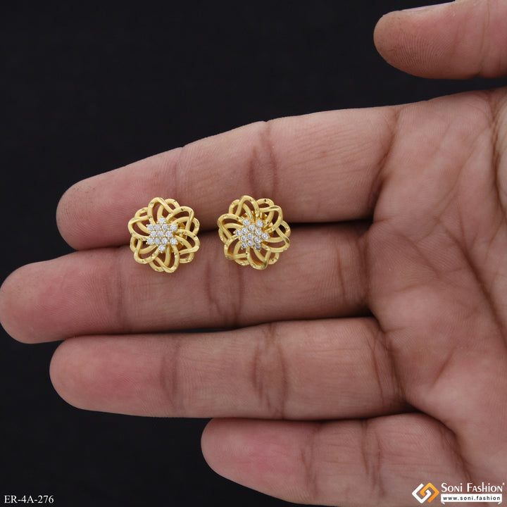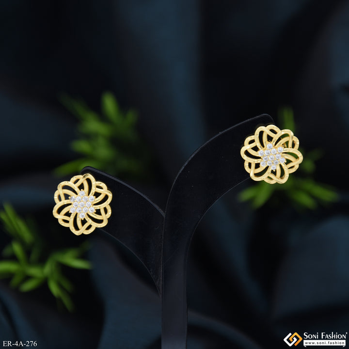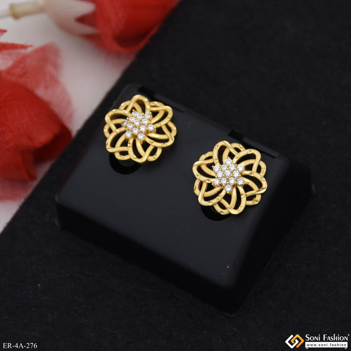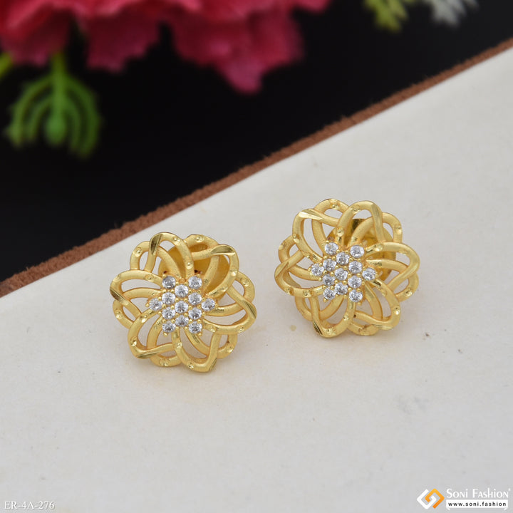 These decorative gold-plated earrings feature a shining round design with diamond accents set on a durable brass base. Their elegant golden finish enhances any outfit, making them perfect for daily wear or special occasions. Lightweight and stylish, they offer lasting shine and comfort.