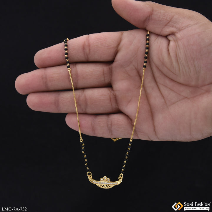 This decorative gold-plated mangalsutra features a shining finish with a single line design, combining black beads and brass elements for a classic look. Adorned with diamond accents, it offers a stylish and elegant accessory perfect for everyday wear or special occasions.