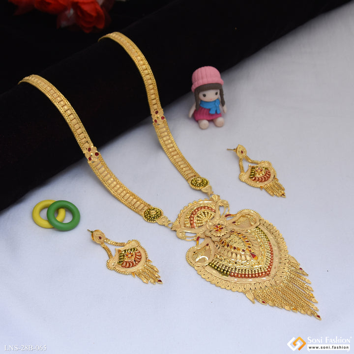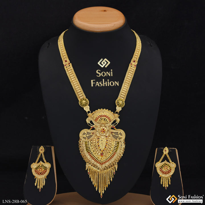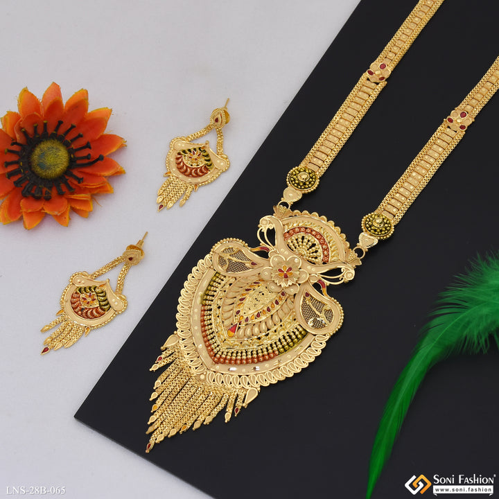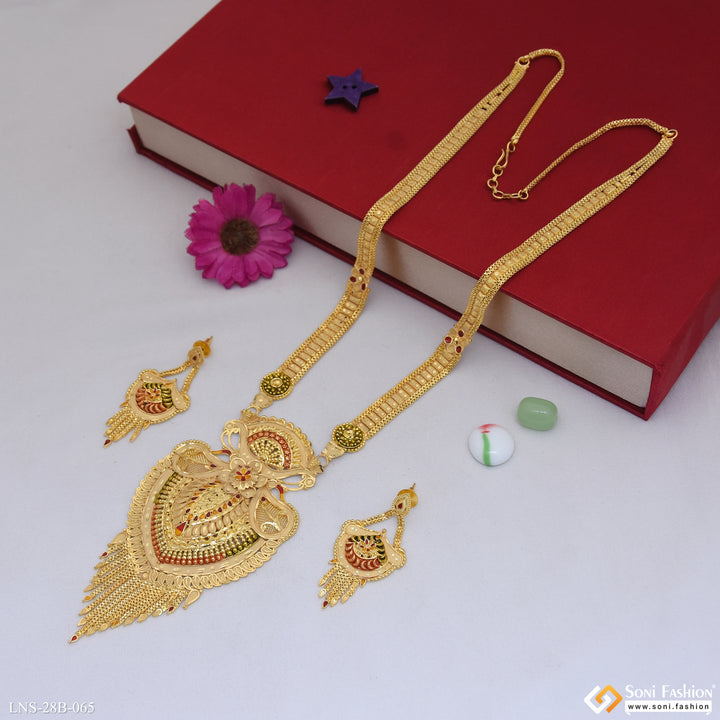 This gold-plated necklace set features a unique, shining filigree design that exudes a royal feel. The set includes a multicolor necklace with a matte finish, crafted from brass and protected by a durable Hid_Reg_Plating. Elevate any outfit with this elegant accessory.