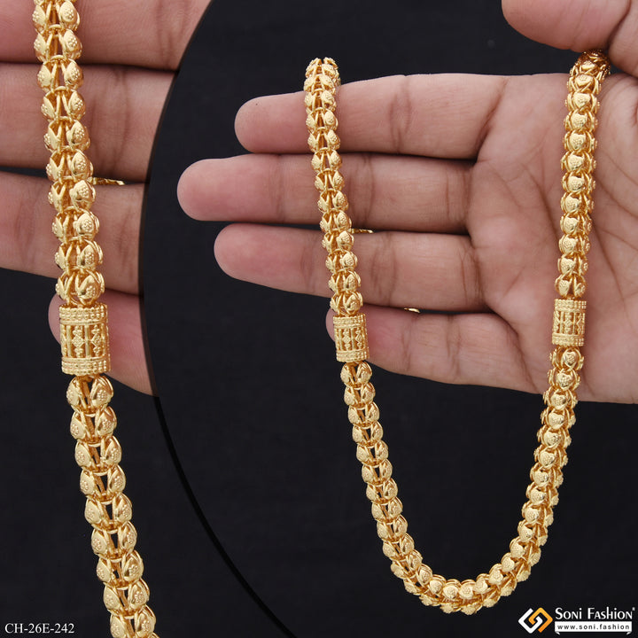 Elevate your look with this 24-inch Delicate Design Gold Plated Rajwadi Chain for Men. Crafted from durable brass with high-quality plating, this golden chain adds a regal touch to any outfit. Its traditional Rajwadi style blends heritage with modern wearability, making it perfect for daily use or special occasions. Lightweight yet sturdy, it offers lasting shine and comfort.