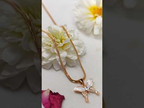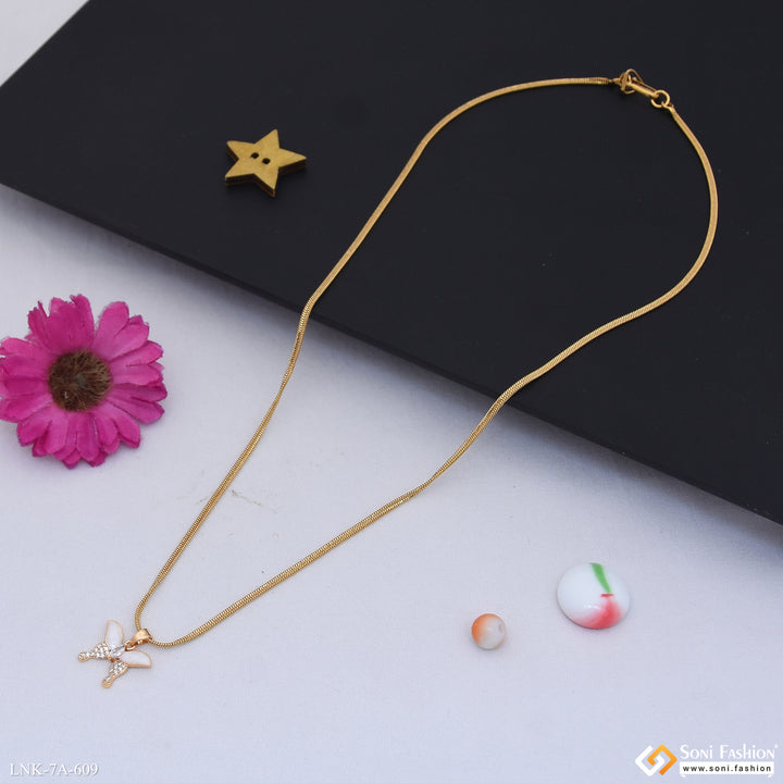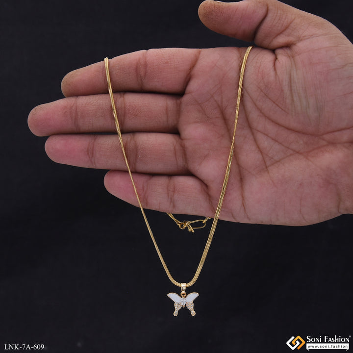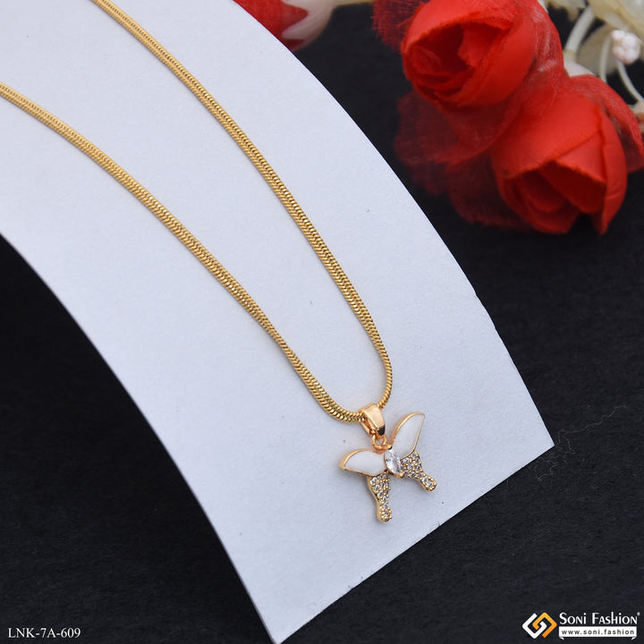 Discover elegance and sophistication with our Designer Gold Plated Chain Pendant. The timeless white necklace boasts a shiny, royal feel, making it a must-have for the latest trends. With hidden regal plating and a glimmering brass base, this pendant features a delicate butterfly design and sparkling diamonds to add a touch of luxury to any outfit.
