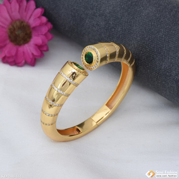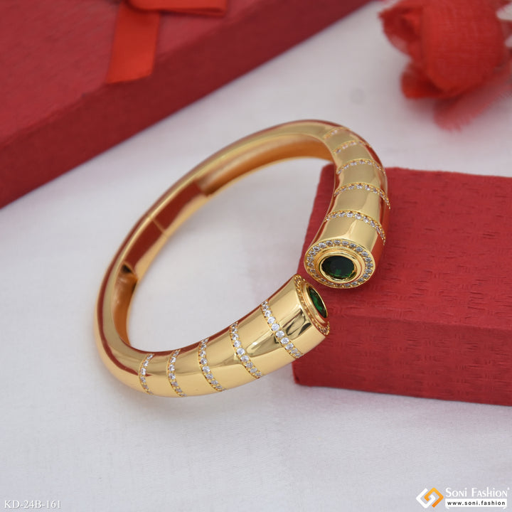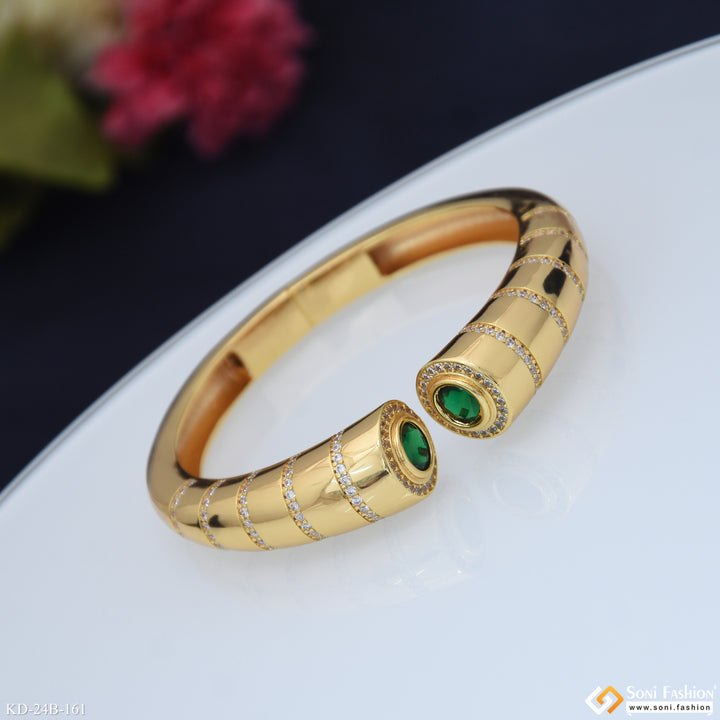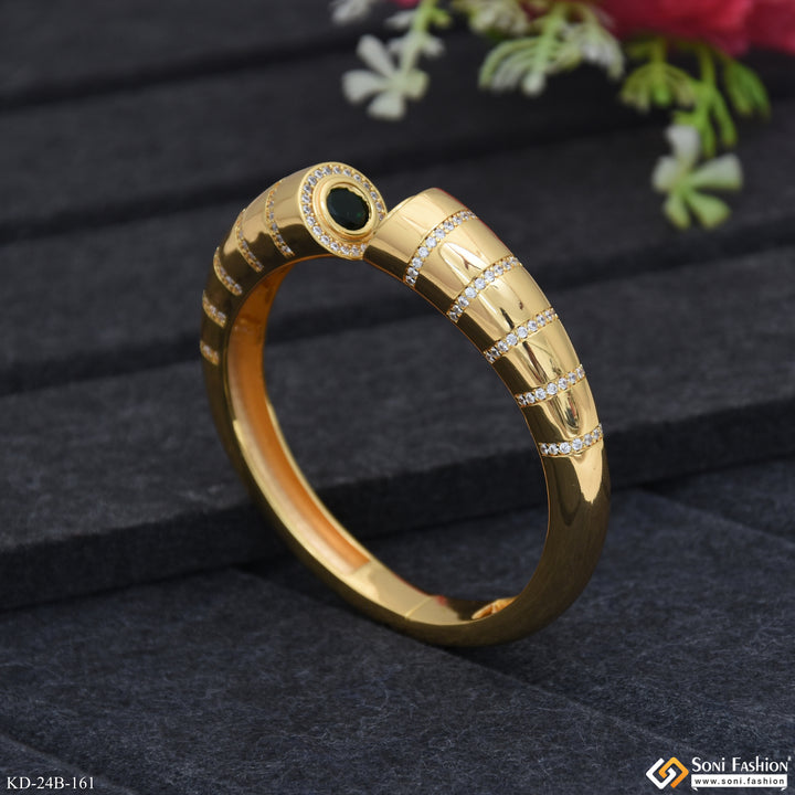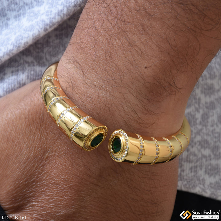 This gold-plated men's kada features a plain oval design with a shining finish that stands out. Crafted from durable brass and enhanced with a hidden regular plating, it offers long-lasting wear. The combination of green and golden tones adds a unique touch, complemented by subtle diamond accents for an elegant look. Perfect for everyday style or special occasions, this kada blends classic appeal with sturdy craftsmanship.