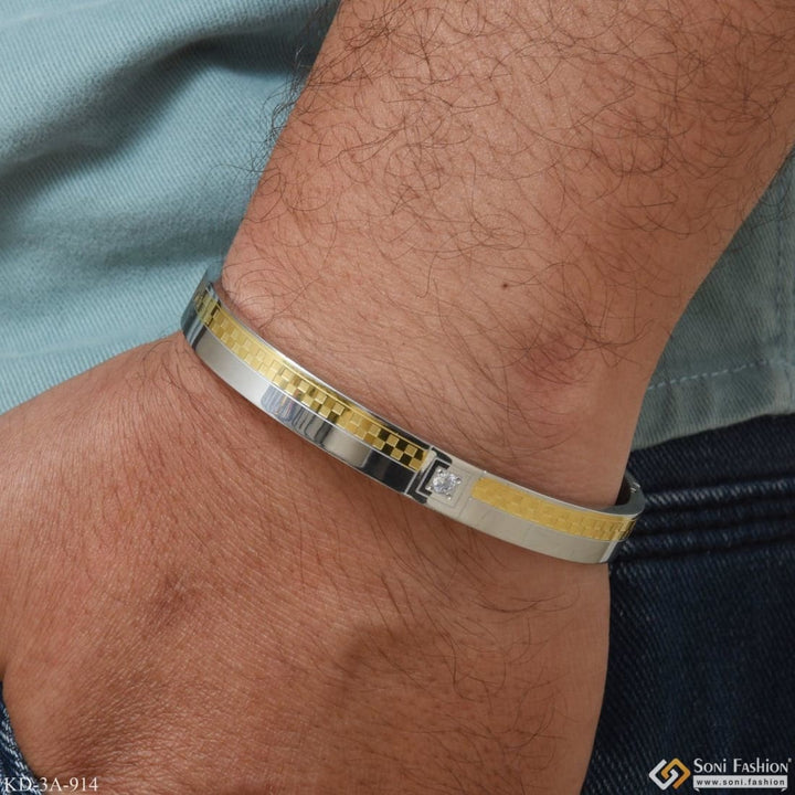 This handsome gold-plated kada is made of stainless steel and is accented with a diamond. Its textured design gives it an extra layer of shining luster, making it an excellent choice for those looking for a high-class men's accessory with prominent style. Silver and gold finishes ensure it stands out. | ||