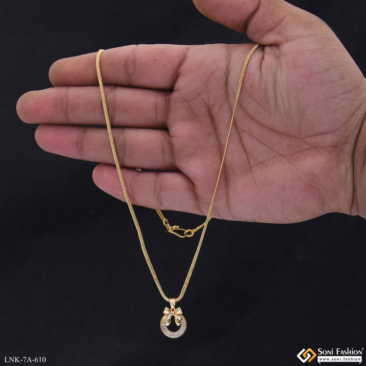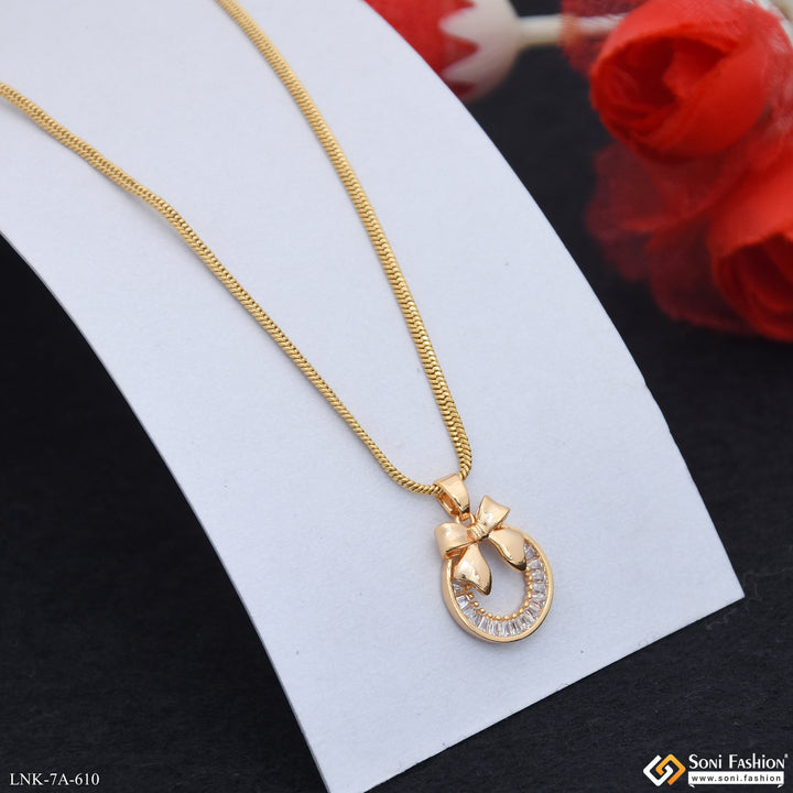 This gold plated chain pendant features a unique bow tie design and shining diamond accents. Made with brass and latest trend of hid_reg_plating, it offers a sophisticated and stylish addition to any outfit. Perfect for ladies looking for a touch of elegance.