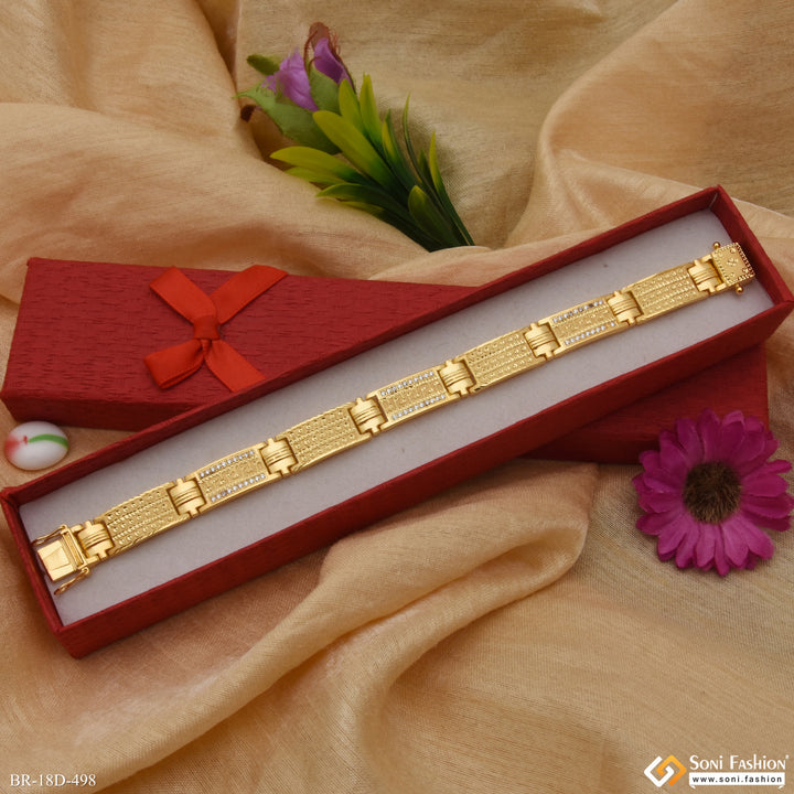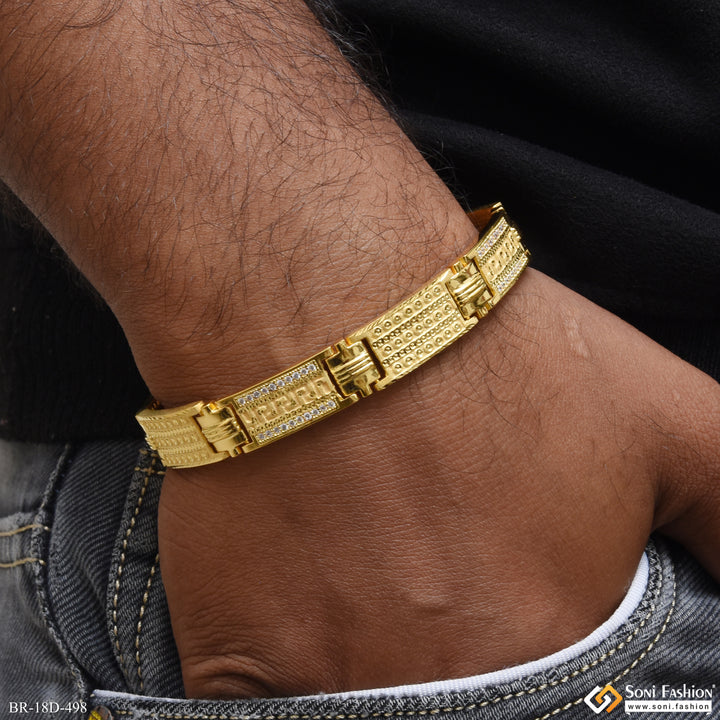 Discover the luxurious touch of the Extraordinary Design Gold Plated Bracelet for Men. Hand-crafted with a shining golden finish and filigree design, this bracelet exudes royal sophistication. Made with premium materials, including brass and diamonds, this piece is a timeless and elegant addition to any outfit.