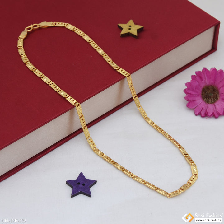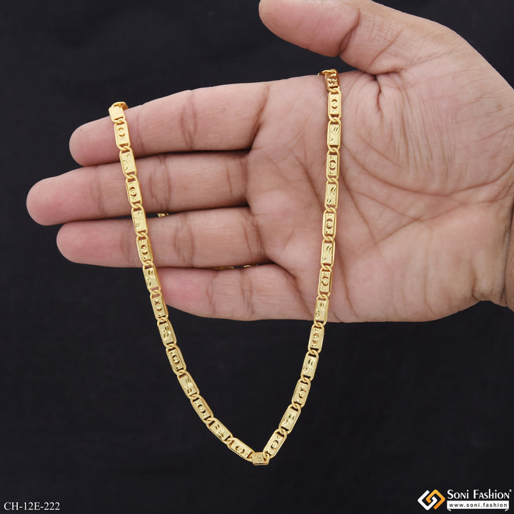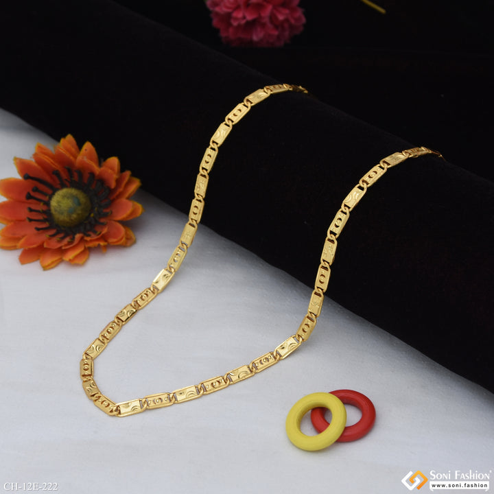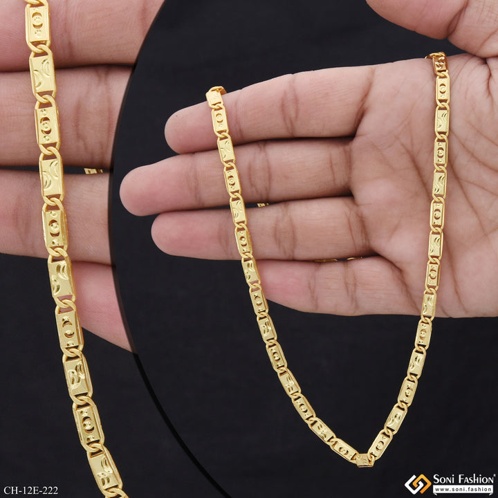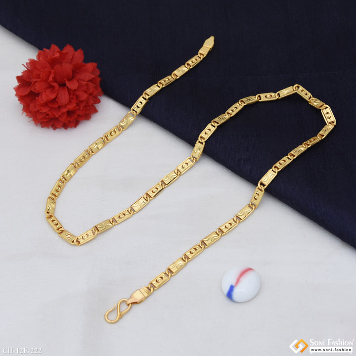 Elevate your style with this 20-inch Fabulous Design Gold Plated Nawabi Chain for Men. Crafted from durable brass and finished with high-quality Hid_Reg plating, its intricate filigree design adds a regal touch to any outfit. Perfect for daily wear or special occasions, this golden chain combines traditional elegance with lasting shine.