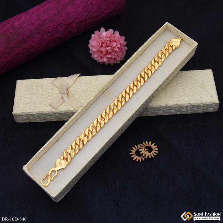 This Fabulous Design Gold Plated Pokal Bracelet for Men features a matt finish and hollow construction, crafted from durable brass. Its golden plating adds a sleek shine while maintaining a lightweight feel, making it comfortable for everyday wear. Perfect as a stylish accessory, this regular-sized bracelet combines elegance with a modern look.