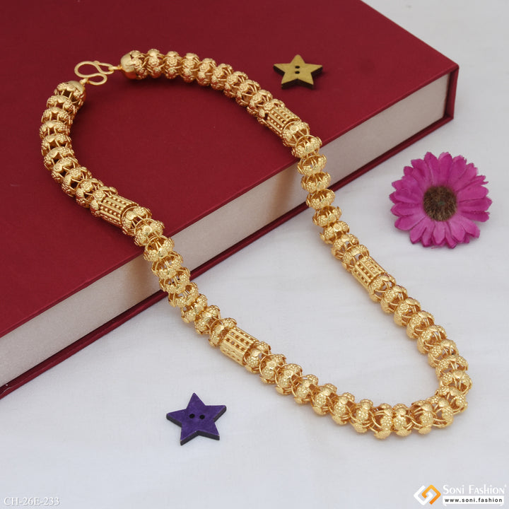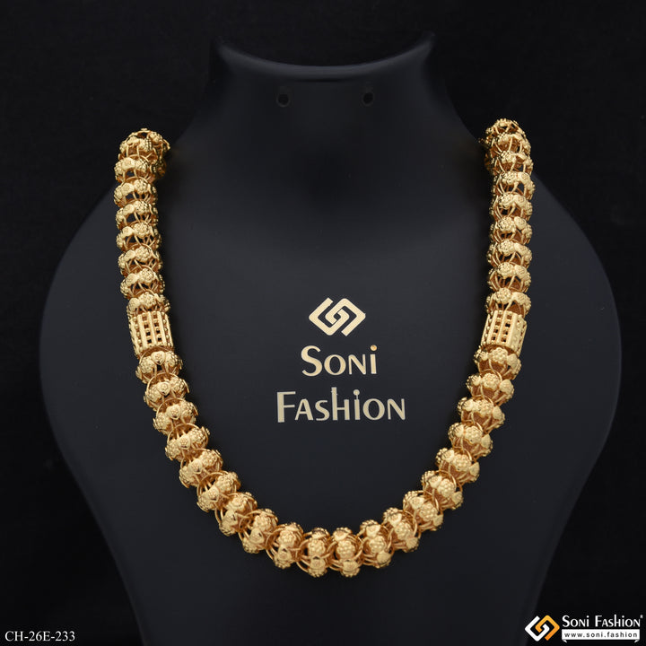 Elevate your look with this Fabulous Design Gold Plated Rajwadi Chain for Men. Crafted from durable brass and coated with rich gold plating, this 23-inch chain offers a shining, royal appeal that complements traditional and modern styles alike. Its classic Rajwadi design brings a touch of heritage sophistication to any outfit. Perfect for daily wear or special occasions, this chain combines elegance and strength with a timeless finish.