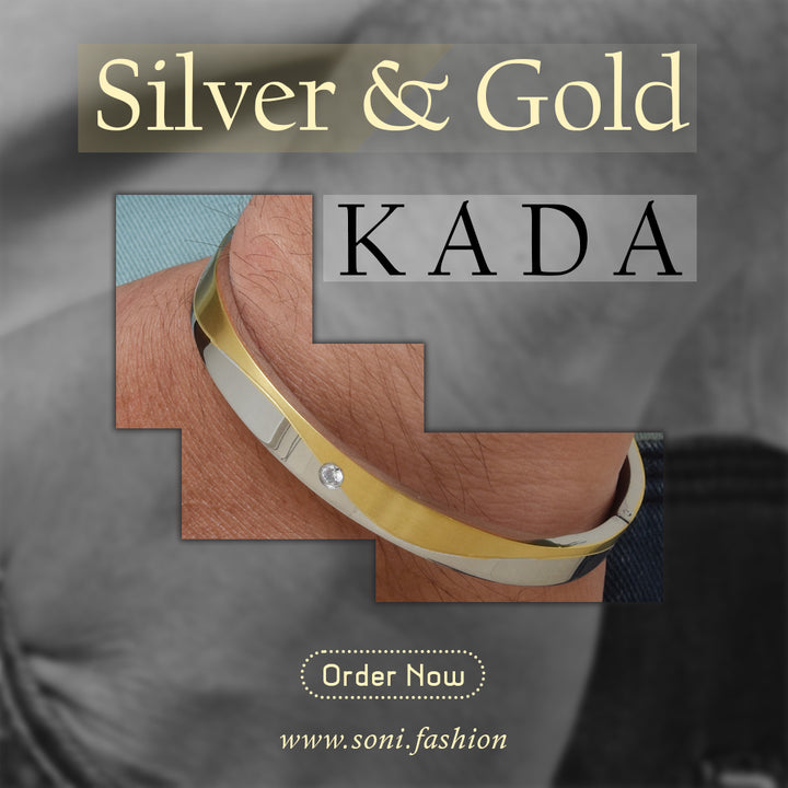 This Modern Silver & Gold Kada for Men gives an eye-catching look with an attention-grabbing design. The stainless steel construction is enhanced with a shining silver and gold colored Hid_Reg_Plating for a trendy and hip hop appearance. Studded with diamonds, this stylish piece of jewelry is perfect for making a statement.