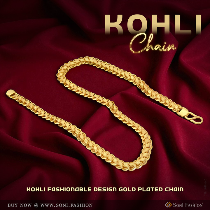 Introducing the Kohli Fashionable Design Gold Plated Chain for Men. This shining and royal chain features a unique filigree design, crafted from high-quality brass and plated with a special hidden regal...