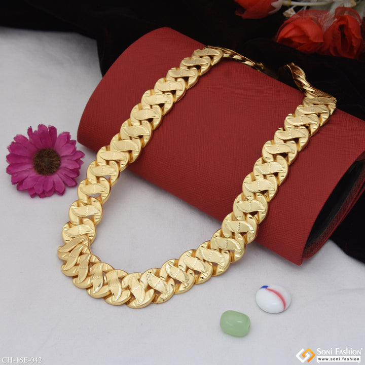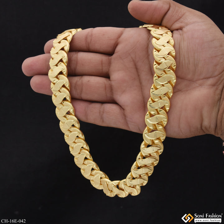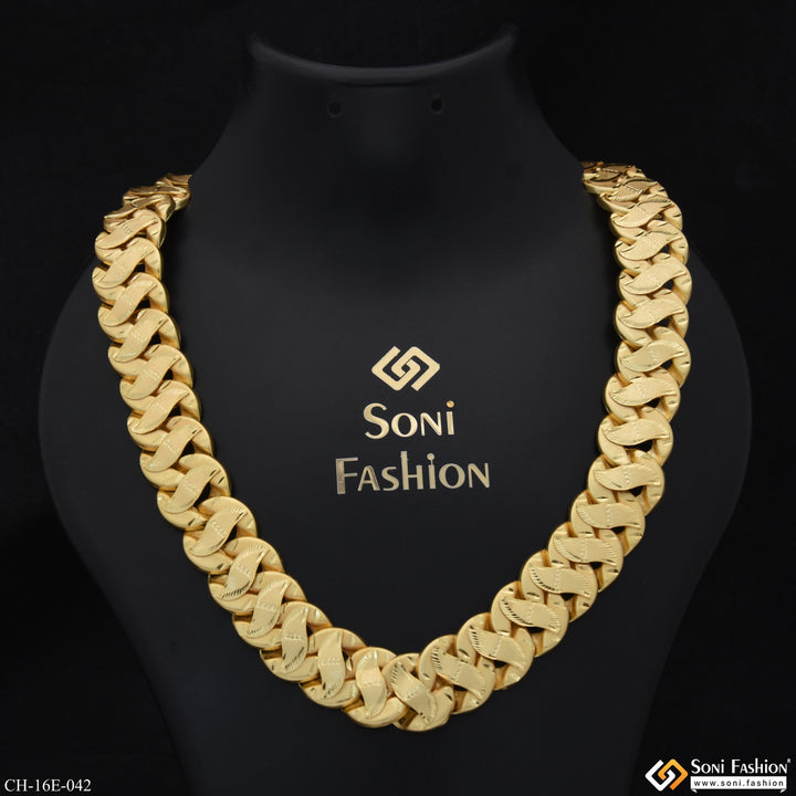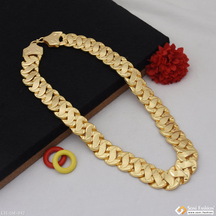 This 20-inch gold-plated Pokal chain for men features a finely detailed, broad filigree design crafted in brass with a matt finish. Its hollow construction ensures comfortable wear while the Rajwadi style adds a regal touch. Perfect for those seeking a blend of traditional elegance and modern comfort.
