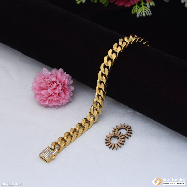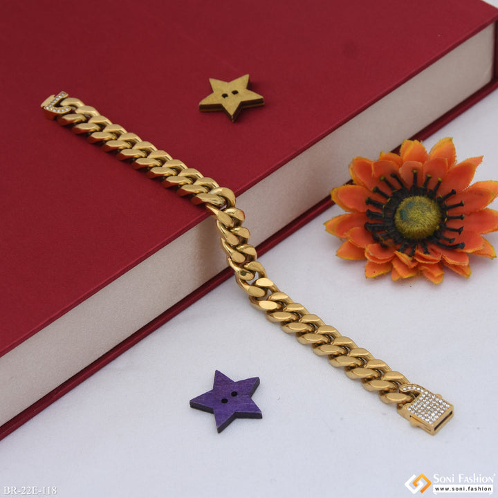 Elevate your style with this striking stainless steel Cuban link bracelet, crafted for the modern man who embraces bold fashion. Featuring a lustrous golden plating that catches the light beautifully, this piece combines durability with contemporary flair. The diamond-accented design adds sophistication to its hip-hop inspired aesthetic, making it perfect for both casual wear and statement-making occasions.