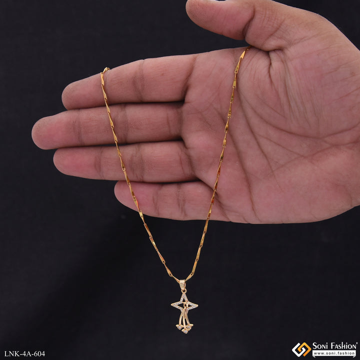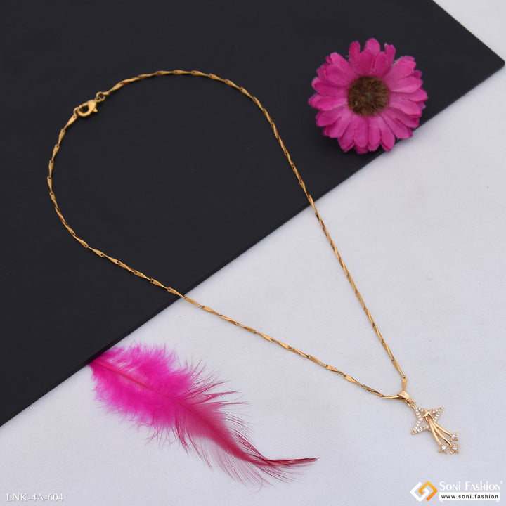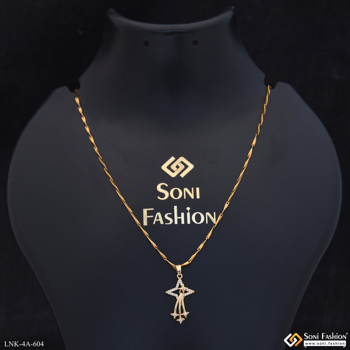 Unleash your inner royal with the Glamorous Design Chain Pendant for Ladies. Crafted from high-quality stainless steel, this pendant shines brilliantly and features a hidden regal plating, making it the latest trend in fashionable jewelry. The golden necklace is adorned with a dazzling diamond, adding even more elegance to this already stunning piece.