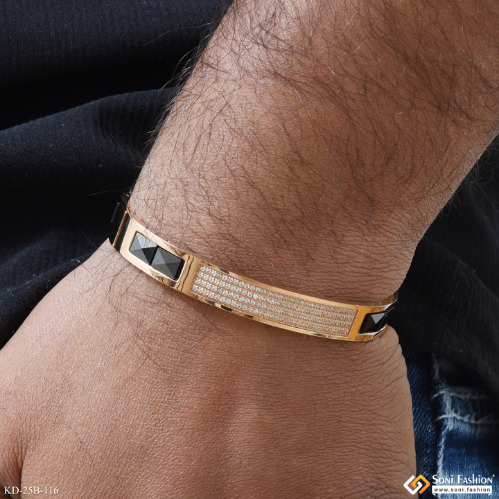 Expertly crafted, this Glamorous Design Rose Gold Color Ceramic & Steel Kada for Men brings a touch of sophistication and style. The shining stainless steel and black ceramic are blended together with Hip Hop inspired design featuring a diamond accent. The oval shape and Hid_Reg_Plating offer a sleek, plain design for the modern man.