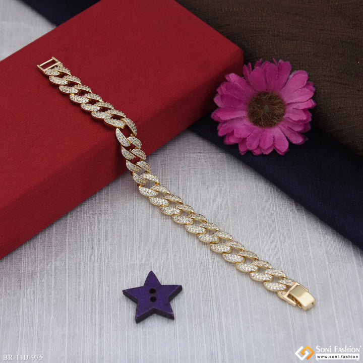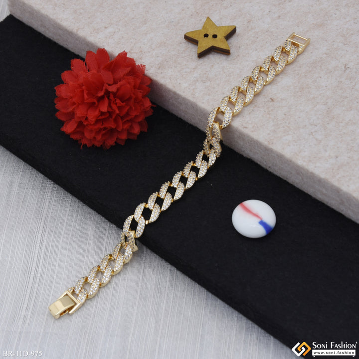 Elevate your style with this glittering gold-plated link bracelet for men. Crafted from durable brass with a high-quality golden plating, it features a sophisticated diamond-like accent that adds a subtle sparkle....