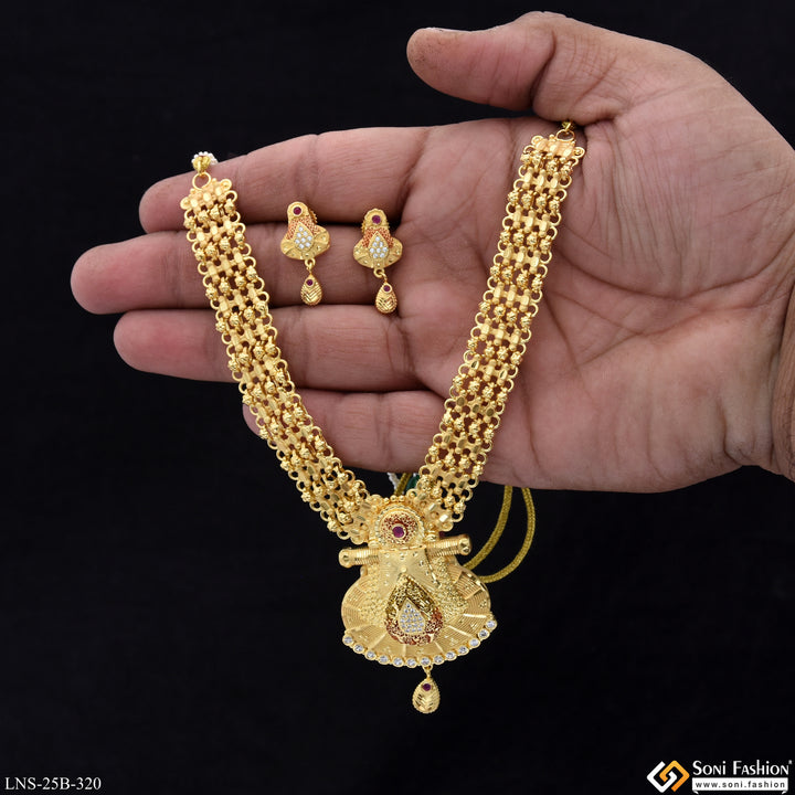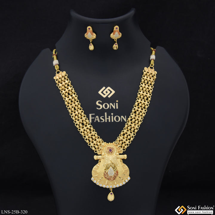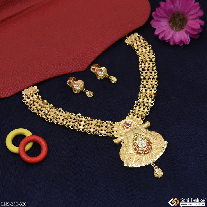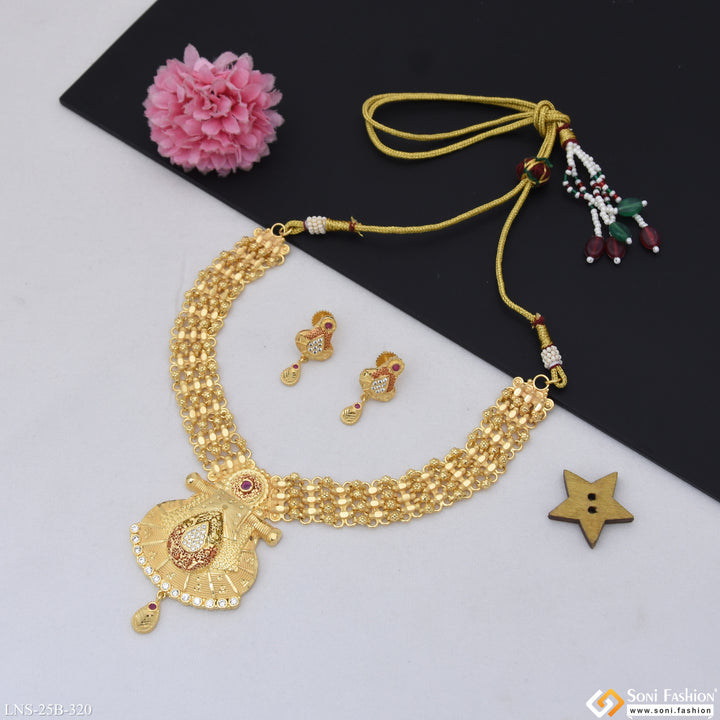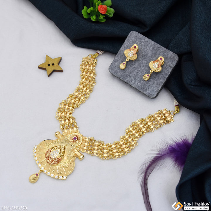 Elevate your jewelry collection with this exquisite gold-plated necklace set, meticulously crafted for the discerning woman. The brass base with premium gold plating ensures durability and a lustrous finish that catches light beautifully. The intricate detailing showcases superior craftsmanship, making it an ideal choice for those who appreciate refined jewelry that makes a statement.