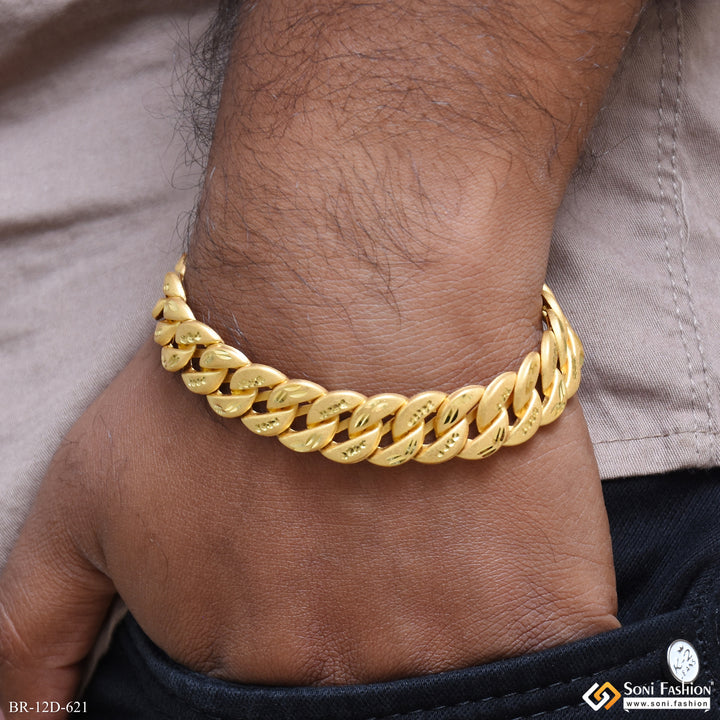 Introducing our Gorgeous Design Gold Plated Pokal Bracelet for Men. This shining bracelet is made with brass and features a filigree design. With a matt, hollow construction and Hid_Reg_Plating, this golden...