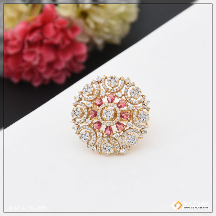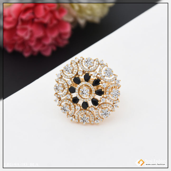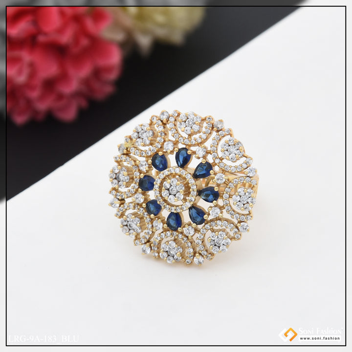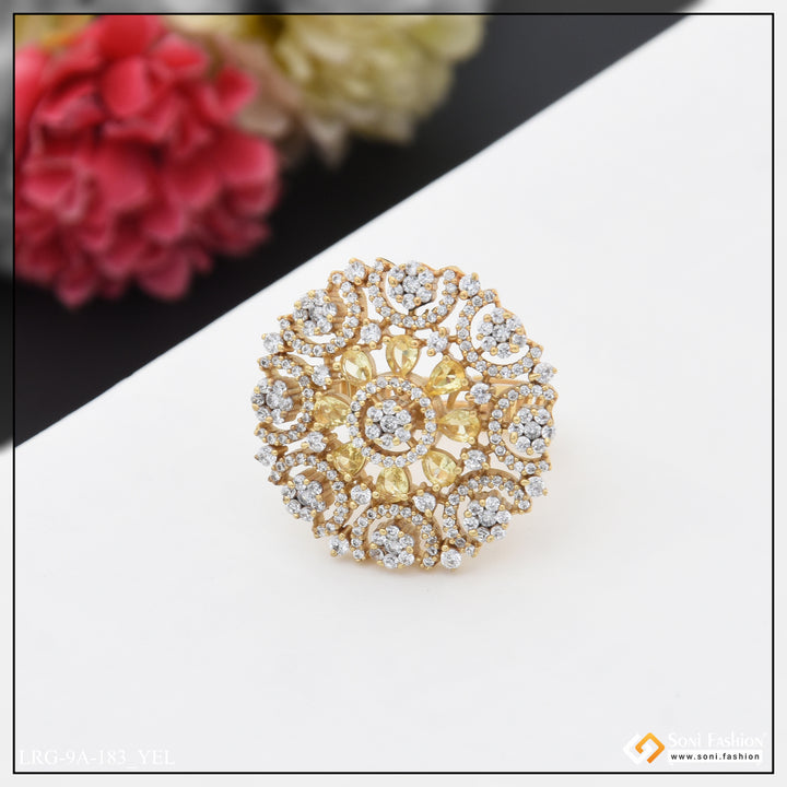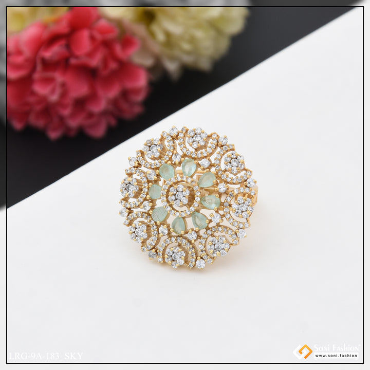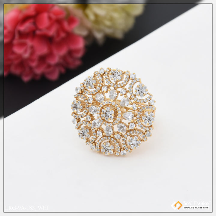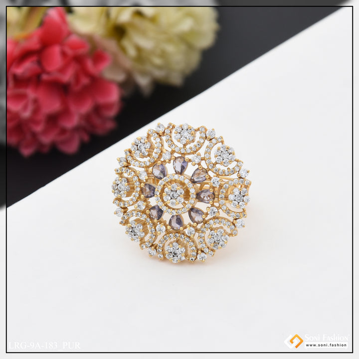 Embrace the latest trend with our Gorgeous Diamond Funky Design Gold Plated Ring. The textured brass and shining diamond stone add a touch of royal elegance. Perfect for hip hop lovers, this multicolor round ring features a unique hid_reg_plating and is a must-have for any fashion-forward lady.