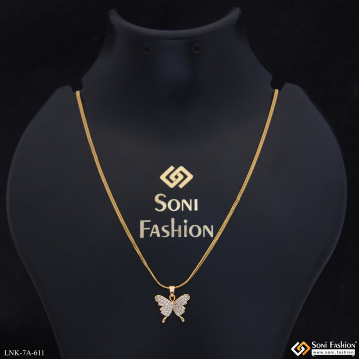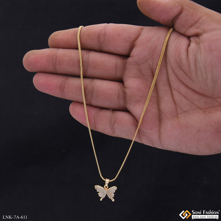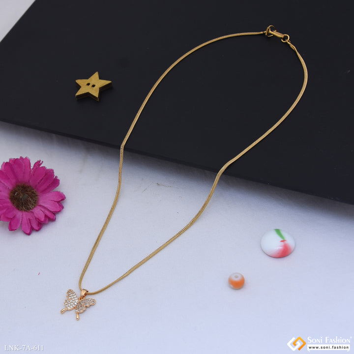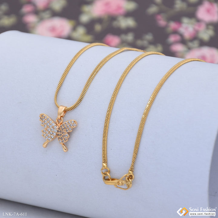 Introducing the Graceful Design Gold Plated Chain Pendant for Ladies. This stunning necklace features shining diamonds and a beautiful butterfly charm, all plated with royal, trend-setting gold. Made with high-quality brass and a hidden registration plating process, this necklace is a must-have for any stylish woman.