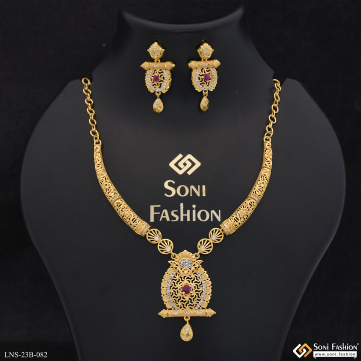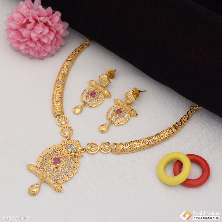 Experience elegance with our Graceful Design Gold Plated Necklace Set for Women. Shining and royal, this pink necklace set features a matt, hid_reg_plating and filigree design for a touch of sophistication....