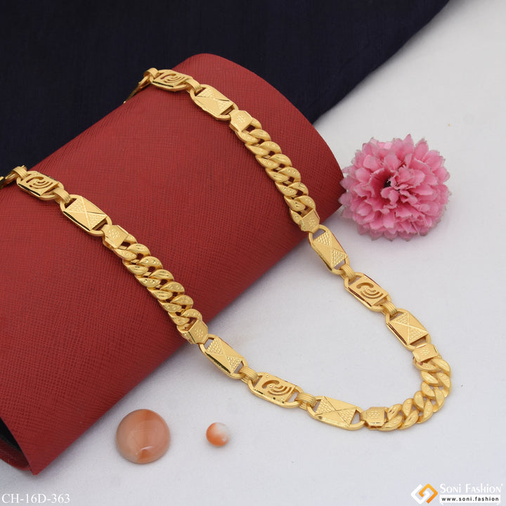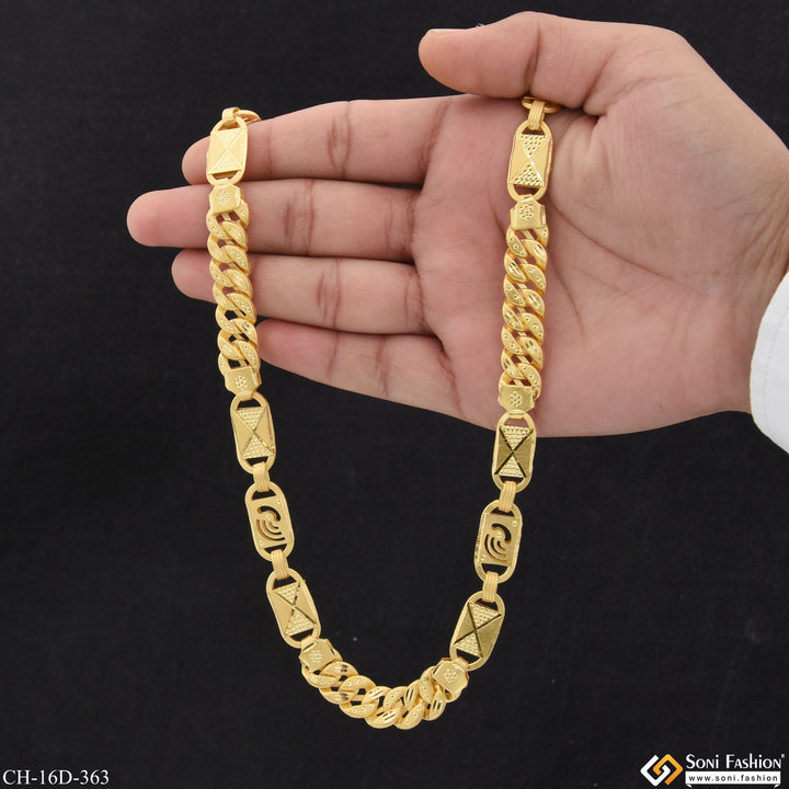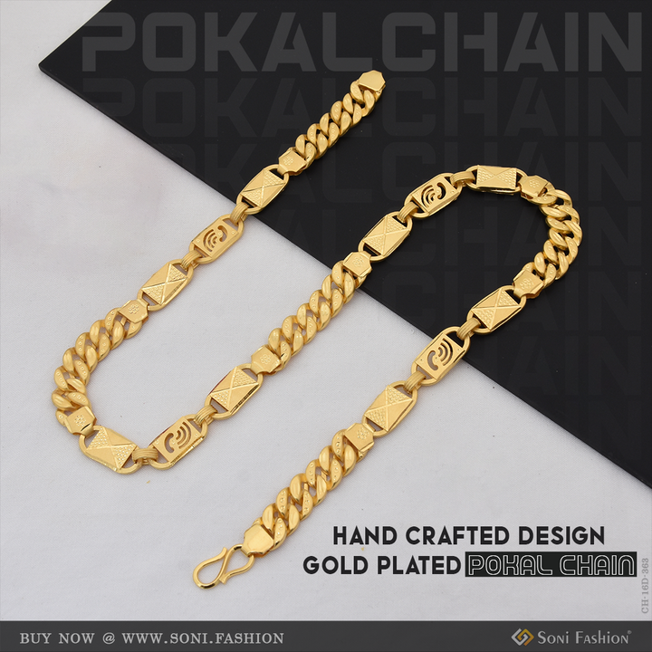 The Pokal Superior Quality Hand-Crafted Design Gold Plated Chain for Men offers a unique textured design and shining finish, making it a standout addition to any outfit. Handmade with brass and featuring a 22 inch chain, this golden chain is both stylish and durable. The Hid_Reg_Plating ensures long-lasting wear.