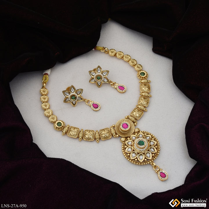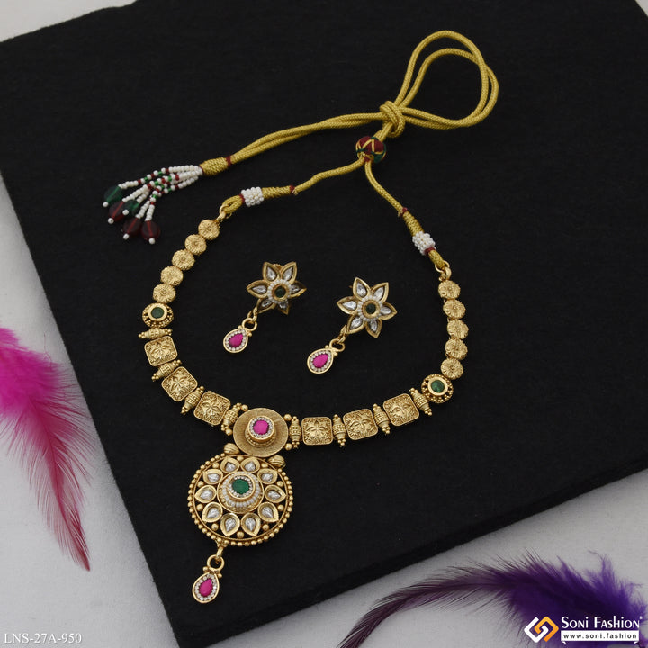 Elevate your style with our High-Class Design Gold Plated Necklace Set for Women. This royal set features a shining multicolor necklace with intricate filigree design and sparkling diamond accents. Made of...