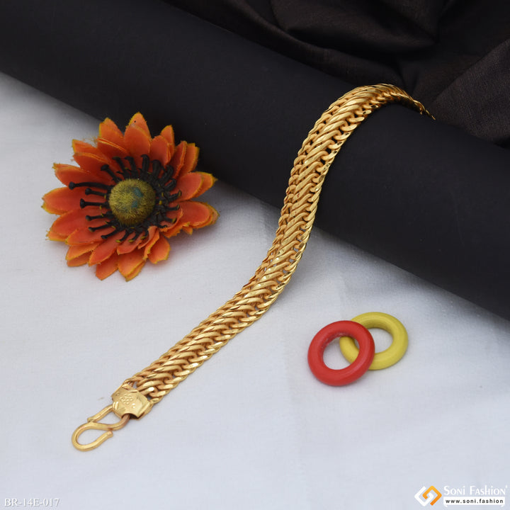Introducing our Latest Design Rose Gold Bracelet for Men. Crafted with textured and shining brass, this bracelet has a royal and matt finish. Complete your look with this hip hop inspired piece, featuring Hid_Reg_Plating and diamond accents. Upgrade your style with our stunning Rose Gold Bracelet-Regular.