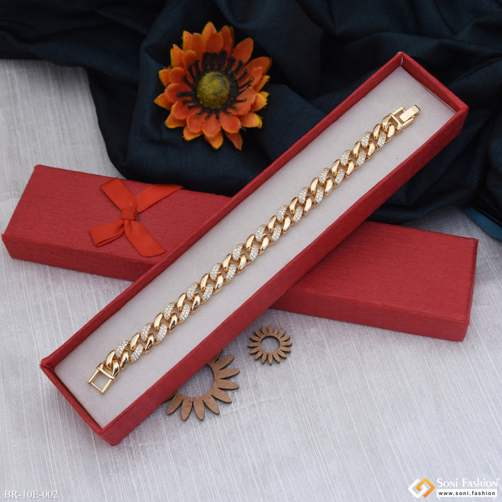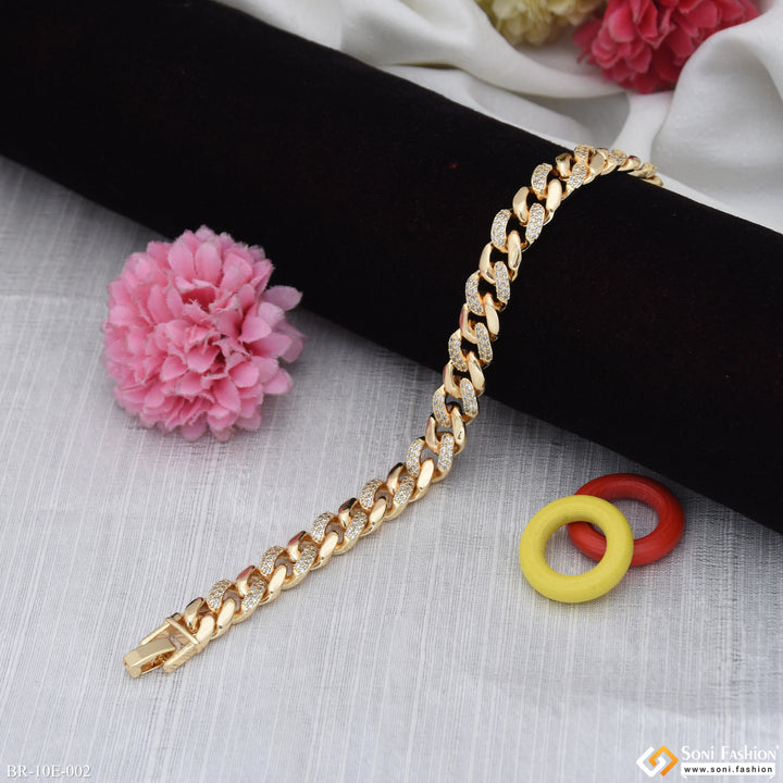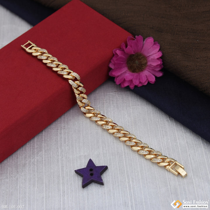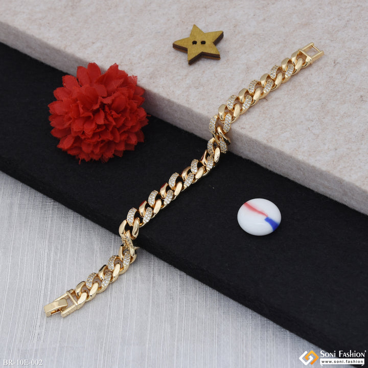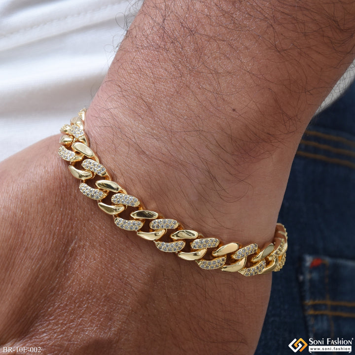 Elevate your style with this Latest Design Gold Plated Link Bracelet for Men. Crafted from durable brass with a rich golden plating, it features a shimmering diamond detail that adds a touch of sophistication. Perfect for hip hop and contemporary fashion lovers, this regular-sized bracelet combines boldness with elegance to enhance any outfit.