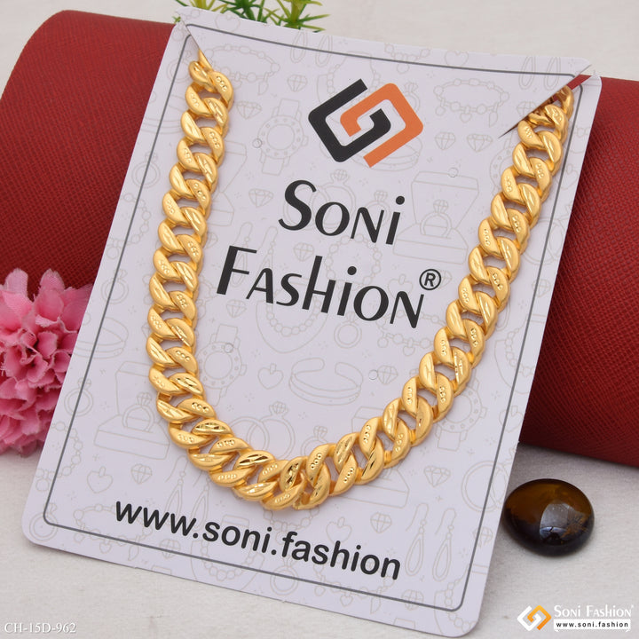This 20-inch gold-plated Pokal chain for men features a royal filigree design crafted from brass with a hollow structure for lightweight comfort. Its shining finish and high-quality plating ensure lasting elegance, making it a stylish accessory for any occasion.