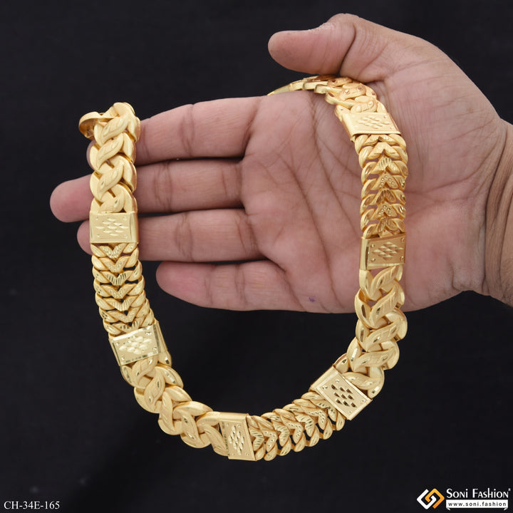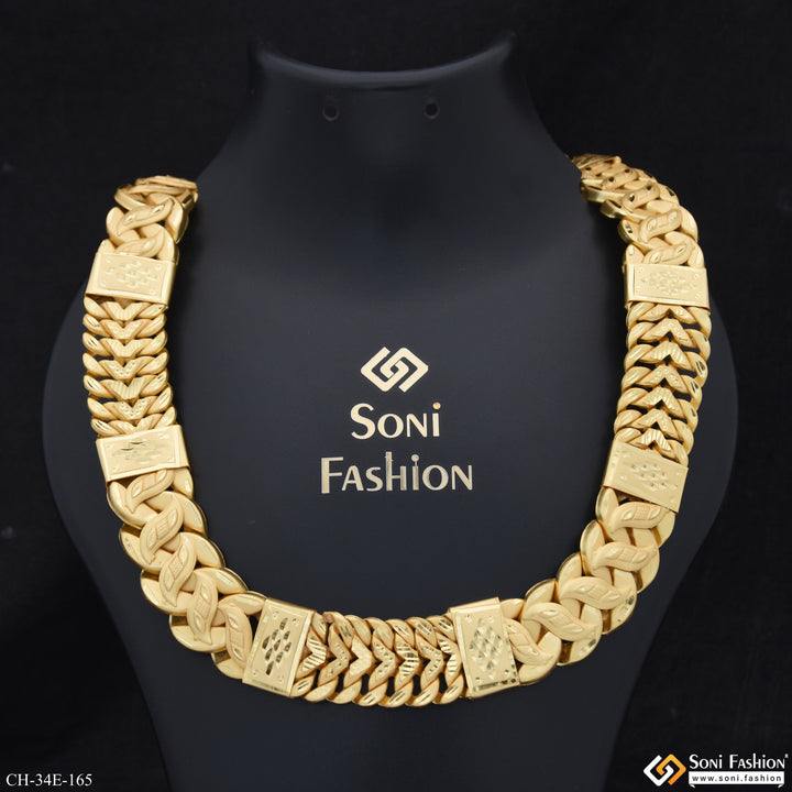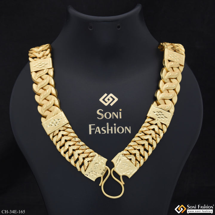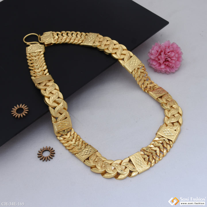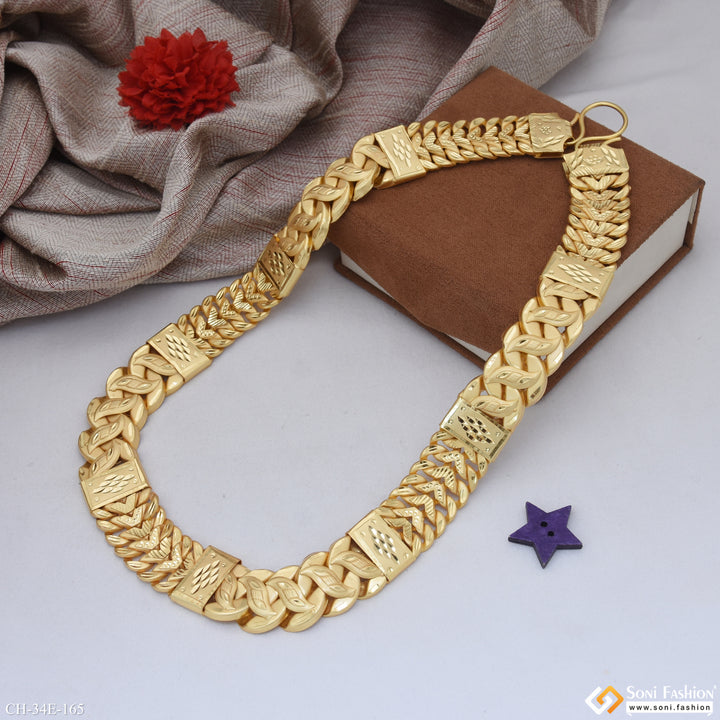 This latest design gold-plated Pokal chain for men features a broad, 22-inch hollow chain crafted from brass with a matt finish. Its intricate filigree detailing adds a unique touch, while the hidden regular plating ensures long-lasting shine. Perfect to complement both casual and formal looks, this stylish golden chain balances durability and elegance.