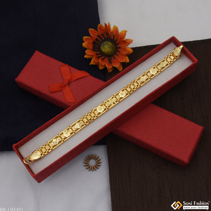 This high-quality bracelet features a stylish Swastik design with a shining matt finish. Crafted from durable brass with a hidden regular plating, it boasts a luxurious gold-plated look that complements any outfit. Designed as a regular box bracelet, it offers both comfort and elegance, making it an ideal accessory for men seeking timeless style.