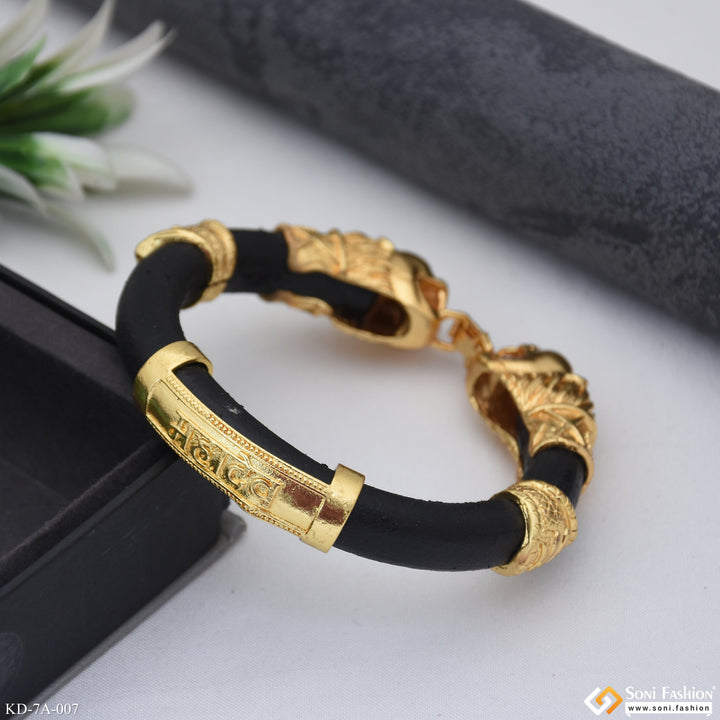 Two-lion Face & Mahadev Genda Kada Classic Design Leather Gold Plated - Style A007