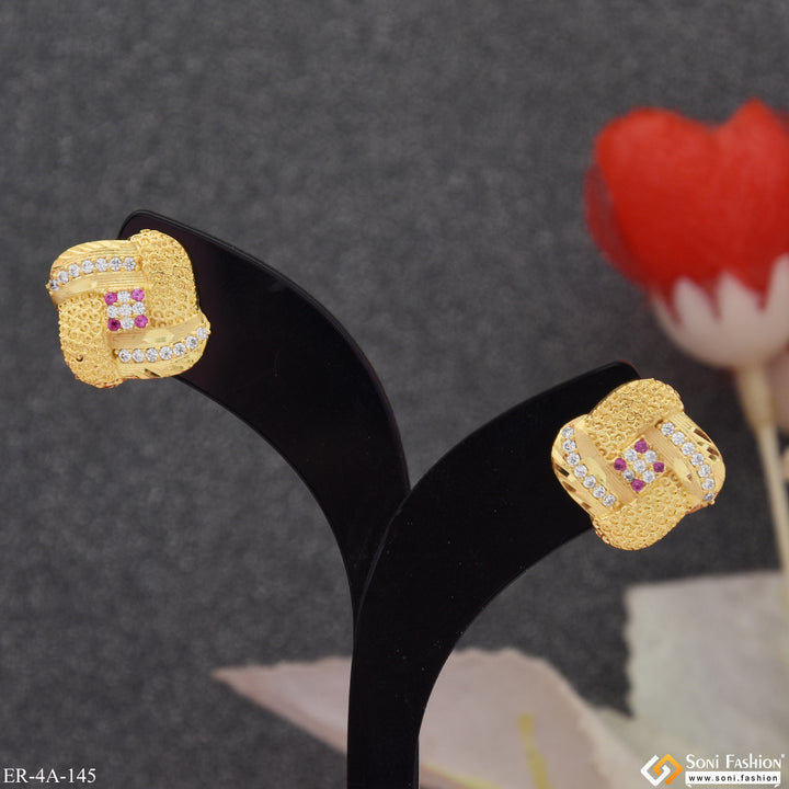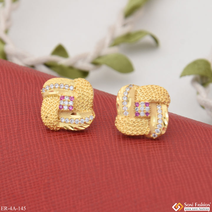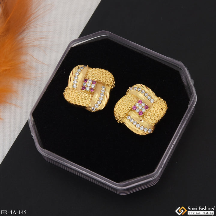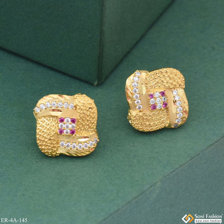 Unleash your inner beauty with our Lovely Design Eye-Catching Design Gold Plated Earrings for Ladies. These textured, shining earrings feature a delicate pink hue and a religious diamond design. Handmade with brass and the latest trend of hid_reg_plating, these golden earrings are a must-have for any fashion-forward woman.